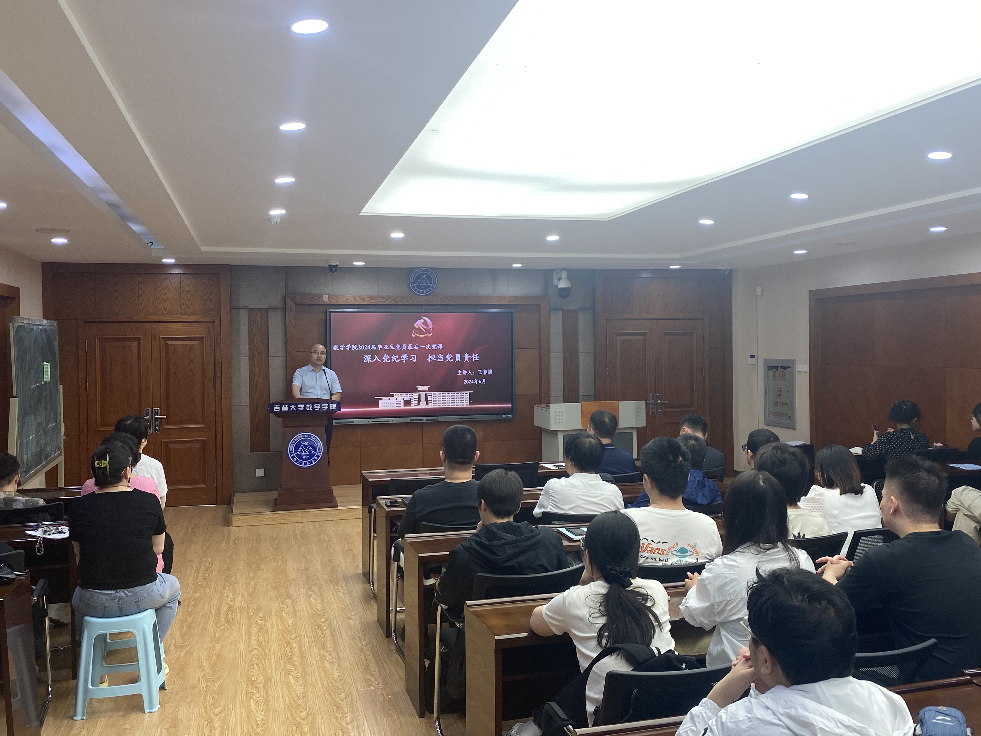 为推动党纪学习教育走深走实,教育引导全体毕业生党员增强纪律意识,在知敬畏、存戒惧、守底线中夯实理念信念之基,在推进强国建设、民族复兴伟业中展现青春作为、彰显青春风采、贡献青春力量。6月17日,数学学院党委书记王春朋为2024届全体毕业生党员讲授了毕业前“最后一次党课”。