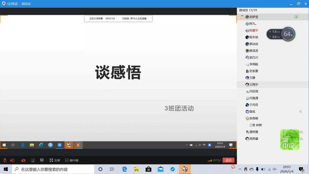为总结讨论同学们在疫情期间的学习与生活,同时学习疫情期间的各种先进事迹2020年7月伊始,数学学院19级三班团支部进行了以“凝聚力量,同青春,抗疫情,共成长”为主题的团日活动
