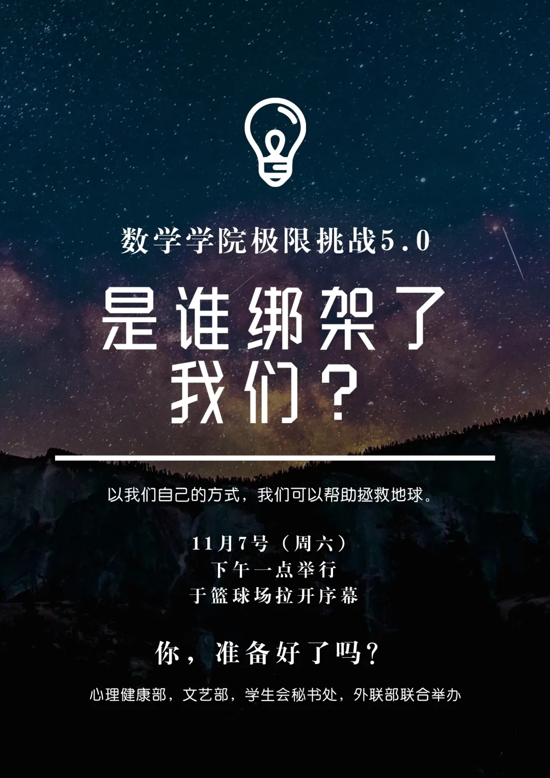 11月7日中午12:30,由数学学院心理健康部、文艺部、学生会秘书处、外联部四部联合举办的“极限挑战5.0之谁绑架了我们”活动正式拉开了序幕,参赛者6人成一小组,组成了16只队伍,共计96人。