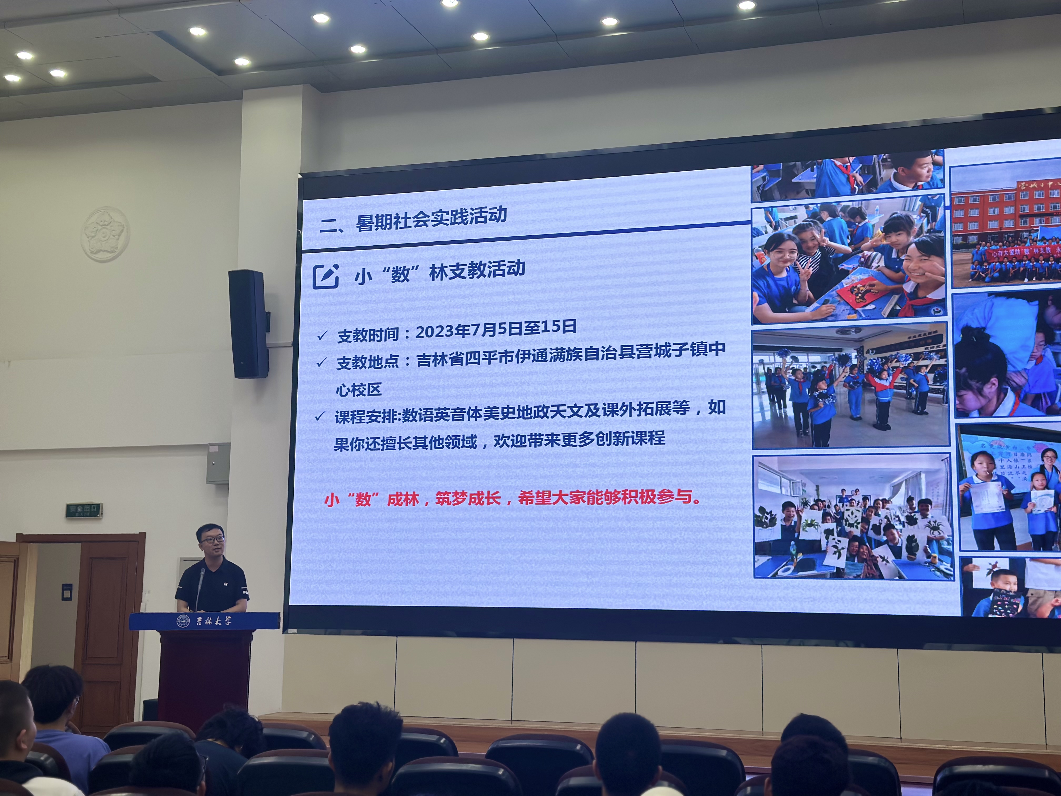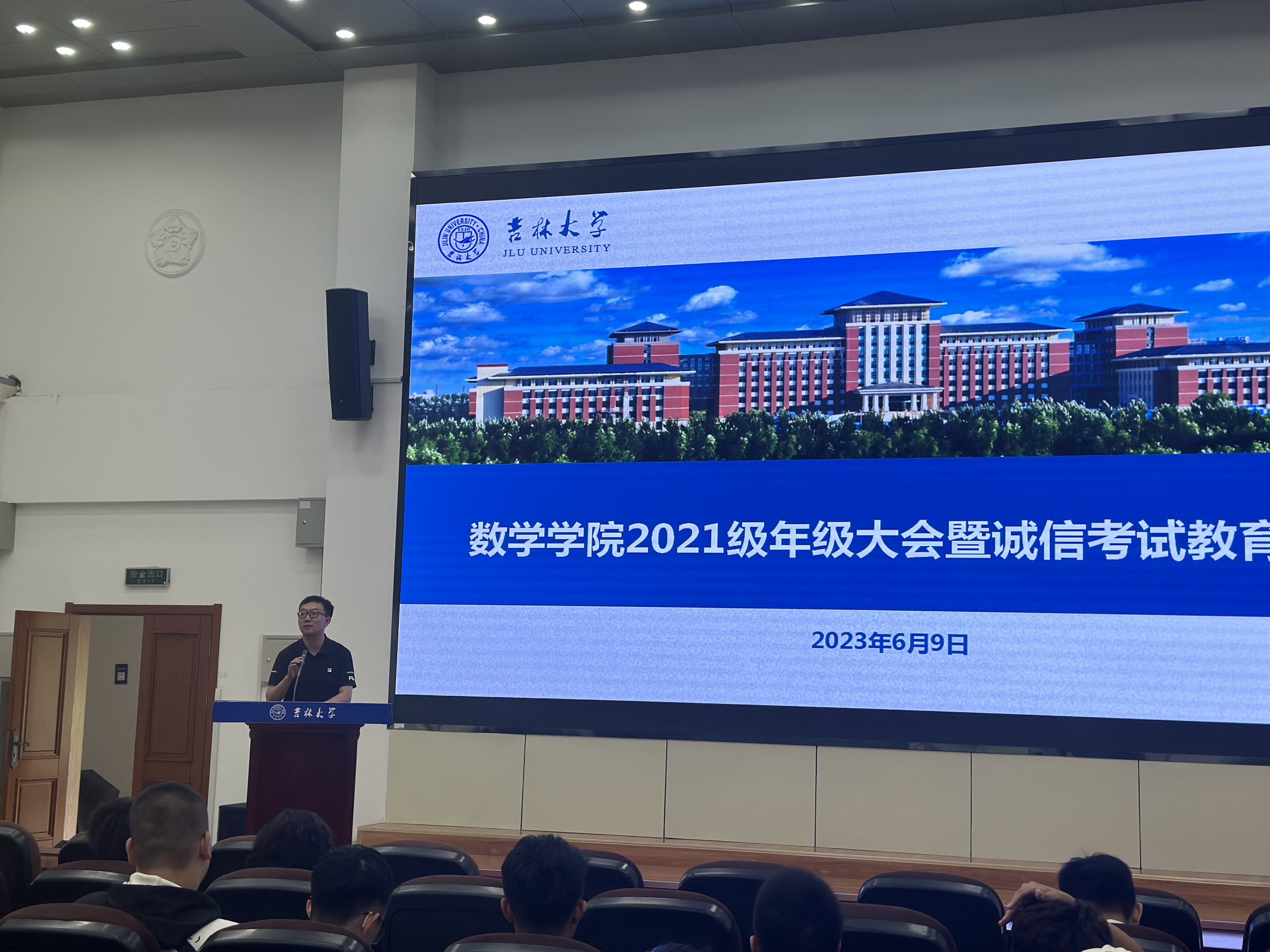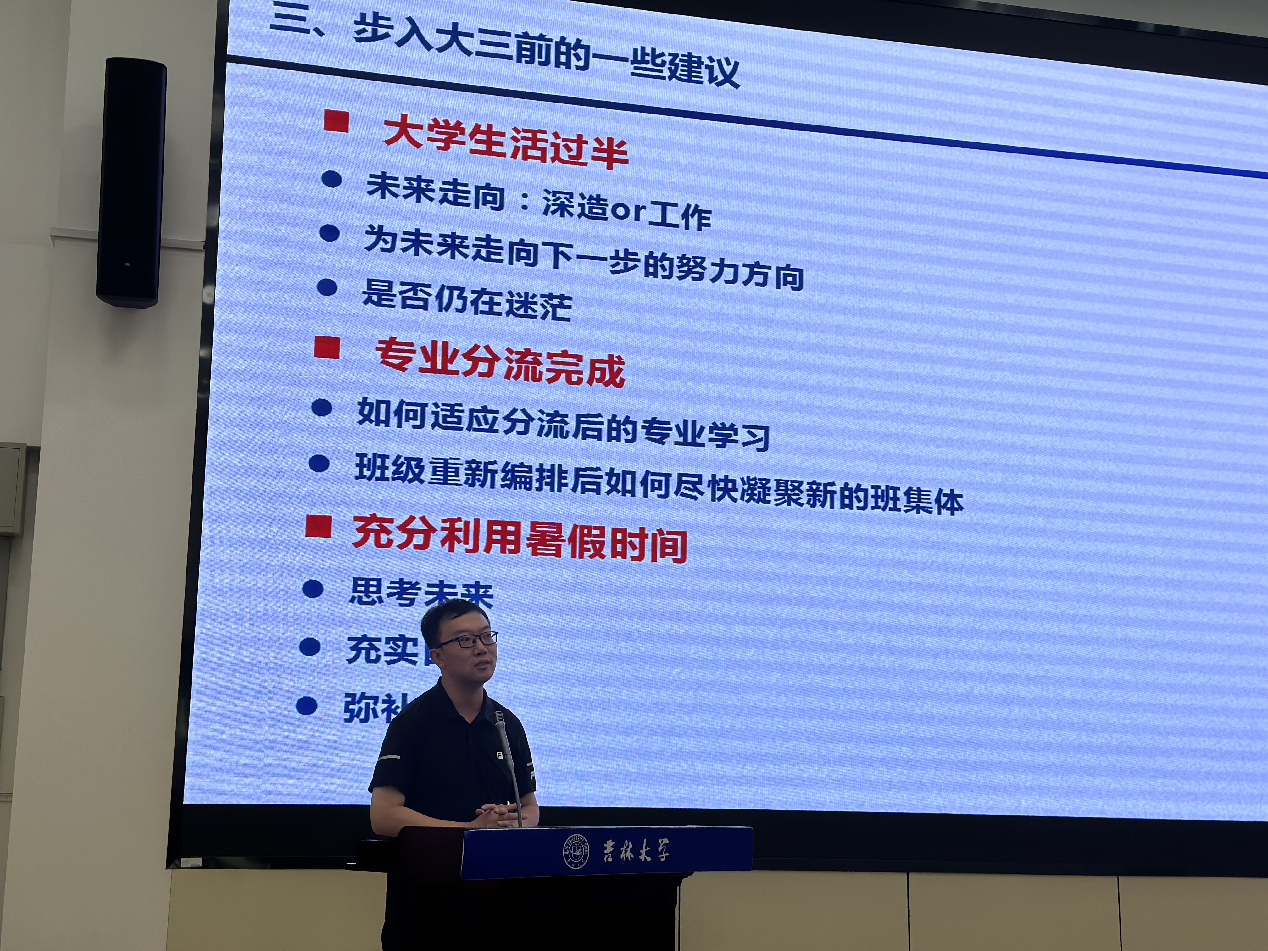 会上,陈晓宇老师带领全体同学共同学习了《吉林大学本科学生违纪处分规定》《吉林大学本(专)科学生考试纪律规范》等相关规定,并通过警示案例,向大家阐明违纪行为的严重后果,强调了学生违纪及解除处分文件将存入个人档案。随后,陈晓宇老师为全体同学介绍了学院暑期社会实践活动的相关安排,讲解了学院课外八学分的有关规定,并重点向全体同学宣讲了学院传统暑期社会实践项目——小“数”林支教团,邀请有兴趣的同学积极参与。最后,结合2021级全体同学即将进入大三学习阶段的时间节点,陈晓宇老师为大家提供了一些步入大三前的建议,一是希望大家能够尽早明确未来走向并为之实施努力;二是希望大家能够尽快适应专业分流后新的班级环境及新的学习内容;三是希望大家能够充分利用暑期时间来思考未来、充实自我并弥补不足。