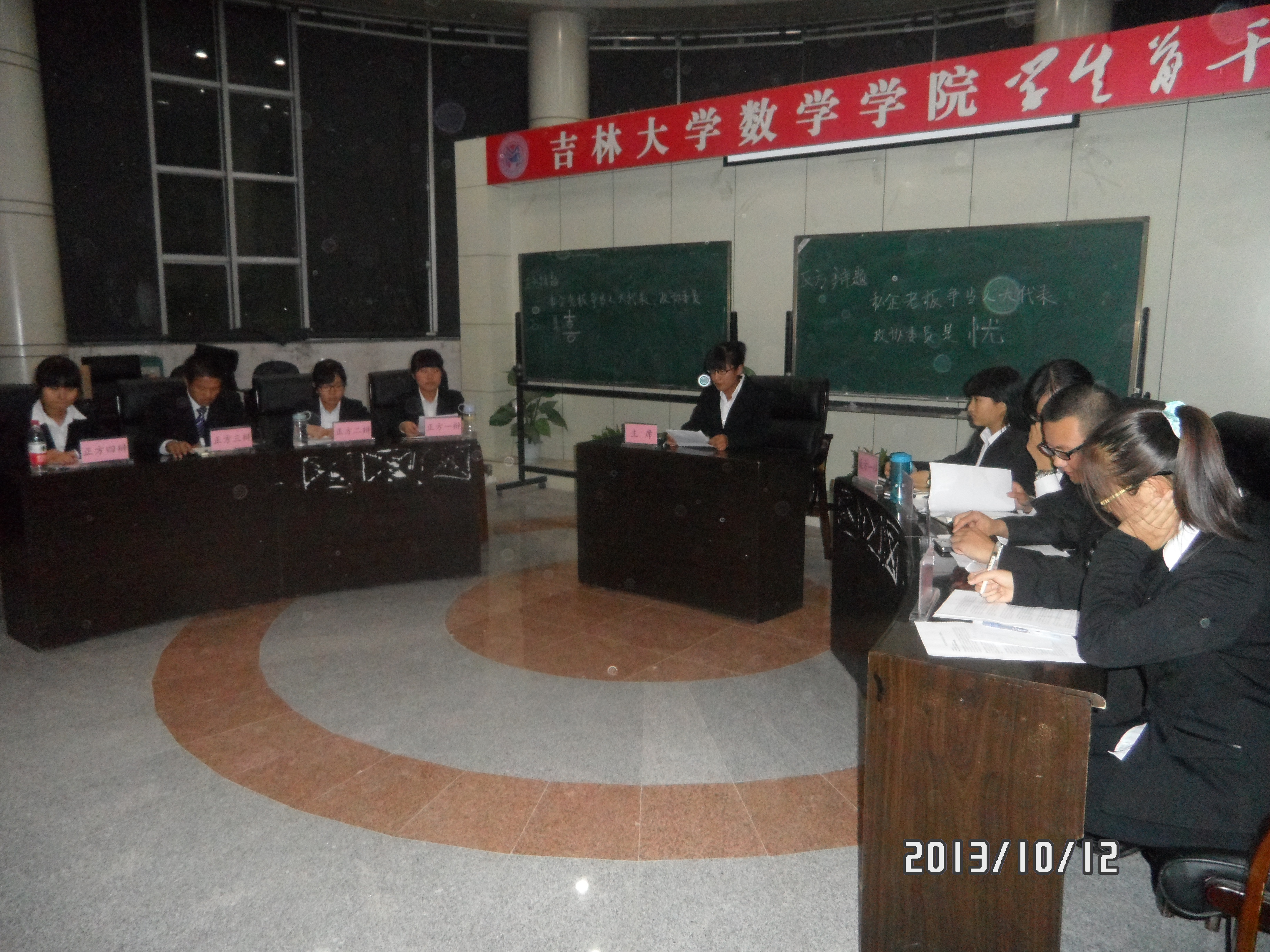 10月12日晚6时,由数学学院学生会学习与学术部与辩论队主办的辩论大赛,在数学楼八楼圆满举行。本次辩论赛特邀团委副书记迟仲达、社联副主席董家君、学生会学生与学术部部长王迪、2010级常务秘书长王翁正及2011级辩论队队长关博文作为本次辩论赛的评委。本次活动旨在从2013级新生中选拔优秀辩手并增进学生友谊。