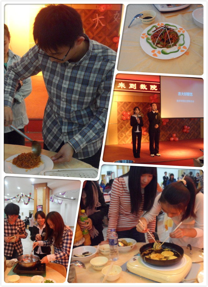 活动开始由主持人介绍比赛规则,然后五组同学开始做他们的拿手好菜,整个大厅都充满了美食的香味。期间主持人对选手进行了采访,比赛的同时有同学上台表演为大家助兴,与观众互动,进行了有趣的“蔬菜蹲”游戏,现场气氛非常火爆。随后进入选手答题阶段,选手们精彩的表现和厨艺赢来了评委与观众的阵阵掌声!后来选手们开始了第二轮的厨艺比赛——创意大比拼。对于随机的食材,选手们在短时间内发挥创意,做出了精美的菜肴。最激动人心就是最后的观众品菜,看着让人垂涎欲滴的美食,观众早已hold不住了。