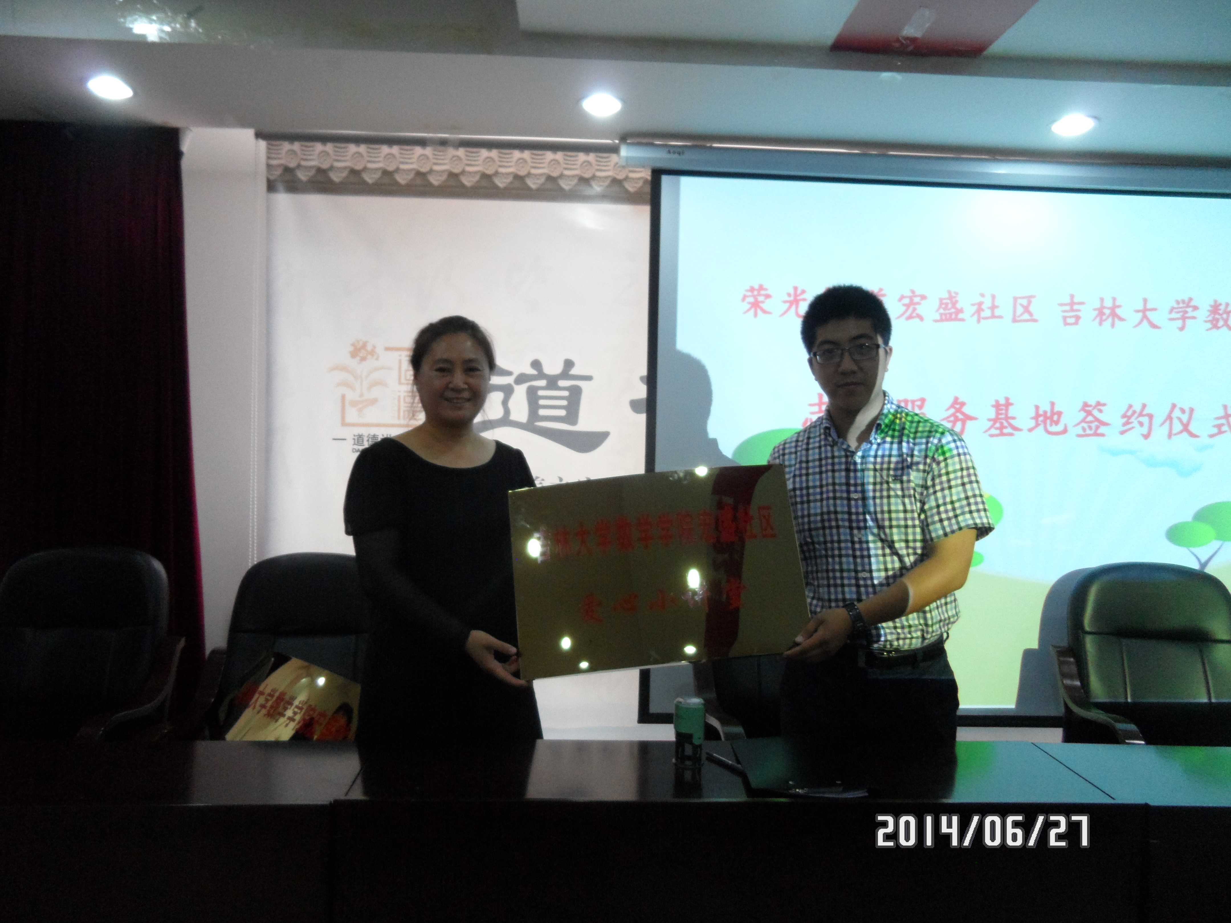 6月27日上午beat365中国官方网站与二道区荣光街道宏盛社区志愿服务基地与“爱心小讲堂”落成仪式在宏盛社区小礼堂举行。数学学院学生办公室主任崔帅老师,团委书记田间老师与宏盛社区李晓丰书记参加了此次活动。街道、社区干部,数学学院大学生青年志愿者等近一百人参加了此次挂牌仪式。数学学院学生资助诚信教育宣传月“走进宏盛社区,共建诚信讲堂”系列活动之一。长期以来,beat365中国官方网站志愿者已与宏盛社区开展了多种形式的服务活动,活动得到了社区居民的好评,同时也为此次志愿服务基地落成打下基础。