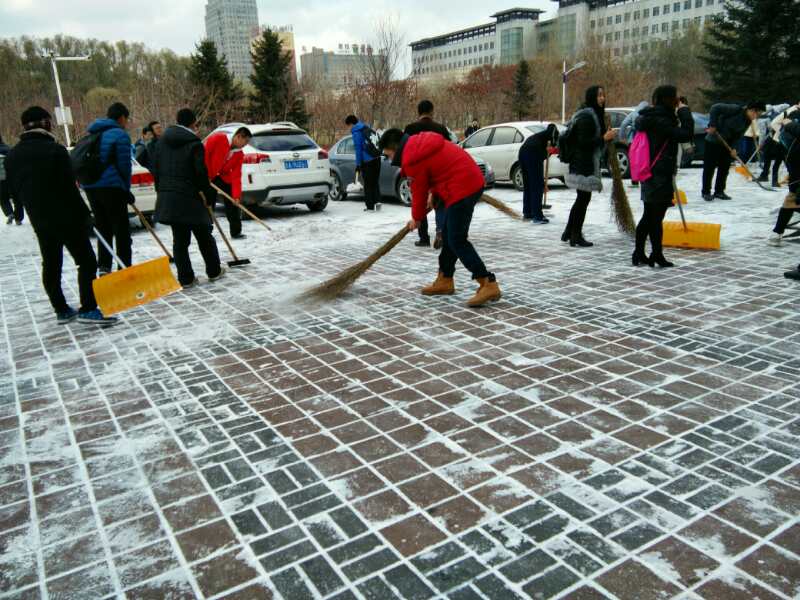为预防积雪带来的安全隐患,增强同学们的团队合作意识,11月8日,在数学学院党委副书记兼副院长赵任老师,2015级辅导员崔帅老师,2016级辅导员李庚老师的带领下,14,15级党员及16级全体学生清扫了数学楼前的积雪。