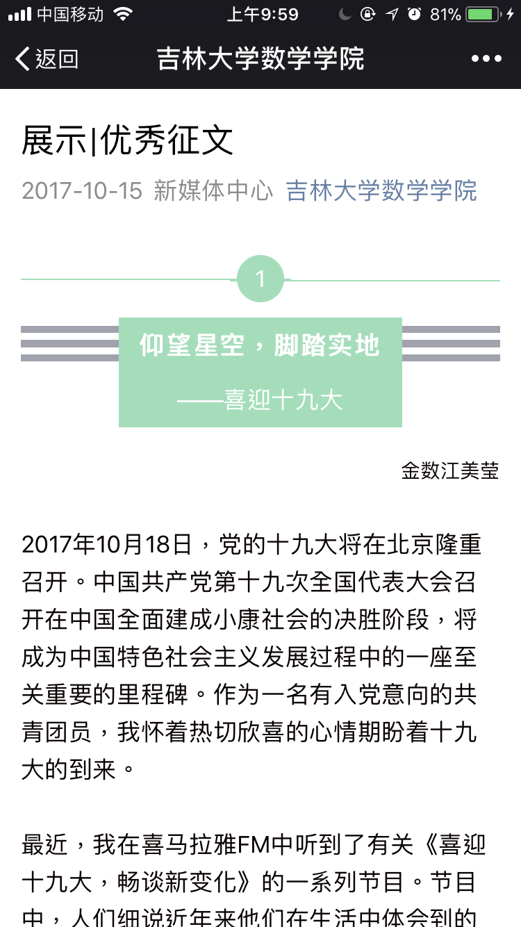 为迎接十九大的召开,数学学院团委社会实践部于九月二十九日至十月九日举办了“青春喜迎十九大 不忘初心跟党走”主题征文活动。
