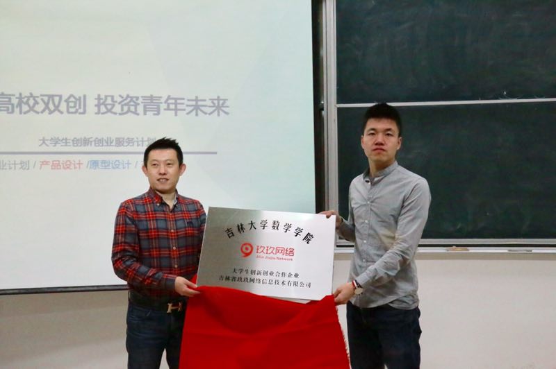 在主持人简短的开场白后,活动拉开帷幕。首先,李庚老师上台发言,他讲到了自己办此次讲座的初衷,这是他学生时代所期待的活动之一,希望大家能从中收获。紧接着,李庚老师和吉软国际董事长李喆先生举行了揭牌仪式,代表着数学学院与吉软国际集团下设的吉林玖玖网络公司开始展开校企合作。接下来,李喆先生和同学们畅聊利用互联网技术,结合专业技能,实现大学生创业,同学们都深受鼓舞。最后,吉软国际技术总监艾文来先生通过PPT、短视频等方式,进一步阐释了如何用所学到的数学技能结合计算机技术进行创新,同时还介绍了互联网+创新创业大赛的基本信息。