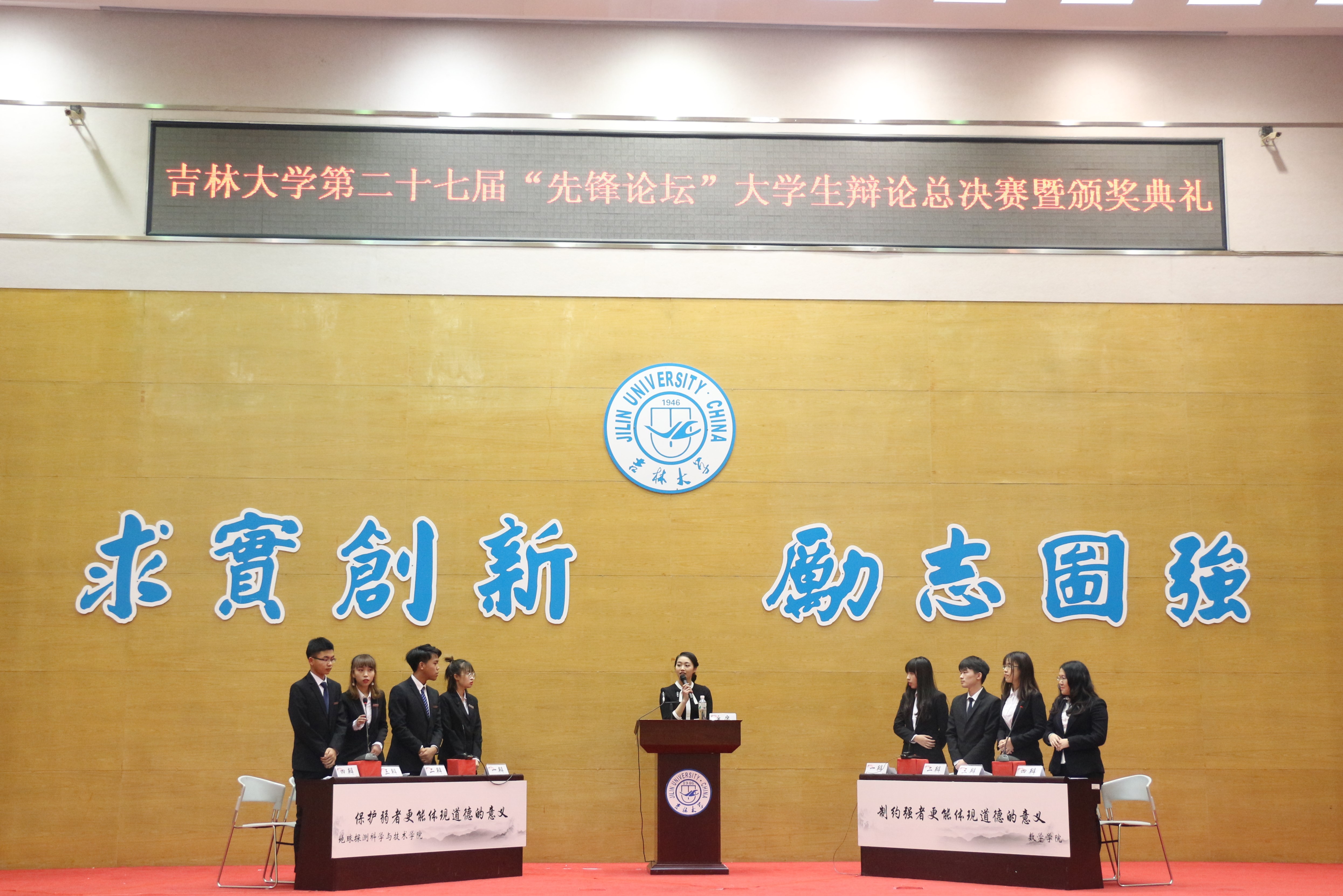 是谁,舌灿莲花,堪使丝竹失色;是谁,唇如利剑,可令管弦无声。在欢呼和呐喊声中决赛拉开序幕,决赛辩题为帮助弱者与制约强者哪一个更能体现道德的意义,数学学院为反方制约强者更能体现道德的意义。我方一辩辛悦开篇立论提出道德的意义在于促进社会和谐发展,并从维护社会秩序,解决社会矛盾,引导正向价值三个方面掷地有声地陈述。我方二辩俞宁宁紧随其后,幽默生动地重申保护和制约的概念,拆解对方观点。应对质询,从容不迫,灵活地化解了对方的进攻。我方三辩程蕾巧妙发问,从动机过程结果三个角度准确地论述了制约强者所能体现出的道德意义。我方四辩刚铭君字字珠玑,鞭辟入里,动之以理晓之以情,一句“不要人夸颜色好,只留清气满乾坤”声震全场,引得掌声雷动。评委老师从学理的角度阐释了对辩题的理解并对场上辩手提出了表扬。在万众期待中,主席宣布结果,数学学院荣获冠军!共青团吉林省副书记牟大鹏为数学学院颁发了奖状以及奖杯。