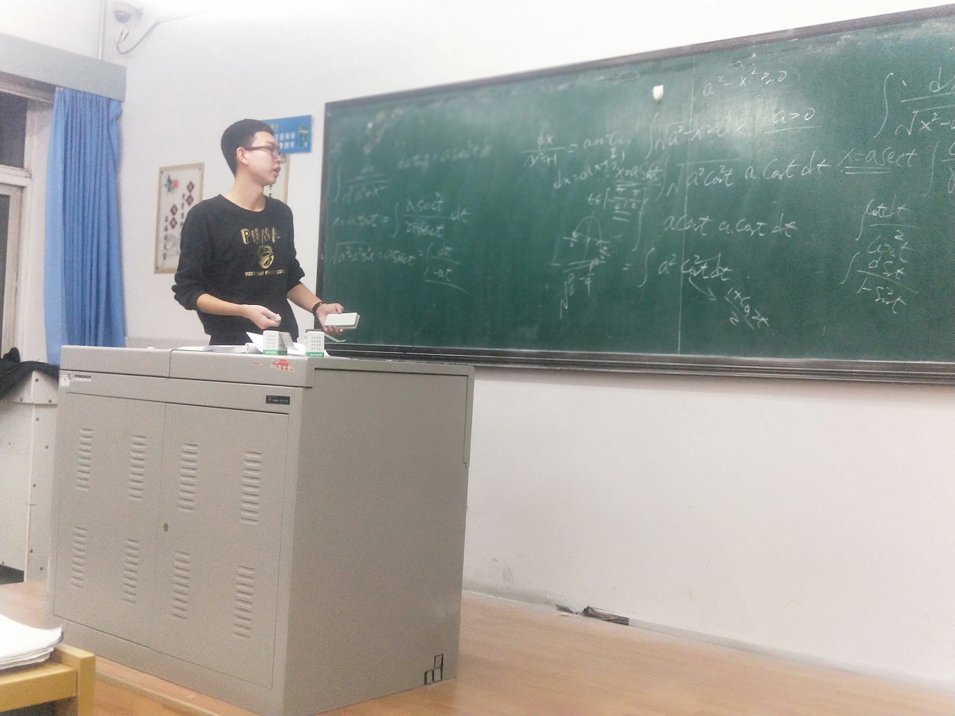 王嘉葳同学的讲解得到了阵阵掌声,随后由石天齐同学为同学们讲不定积分。作为积分学的开端,石天齐同学为这次课做了充足的准备,他从不定积分的产生,不定积分的定义,不定积分的性质和不定积分的运算法则等方面对不定积分的基础知识进行了全面的梳理。紧接着石天齐同学又向大家提问了一些基本初等函数的原函数,并简单讲解了第一换元积分法、第二换元积分法和分部积分法,石天齐同学在知识点之间穿插了很多例题,将理论知识应用在实际问题中,加深了同学们对不定积分的理解。在石天齐同学精彩的讲解之后开始了答疑环节。同学们向志愿者询问了许多线下活动和近期高数课程中遇到的问题,志愿者们对同学们的疑问进行了耐心的解答。并对与这些问题相关的知识点做了解释。全部问题解答完毕,大家合影留念,本次活动圆满结束。
