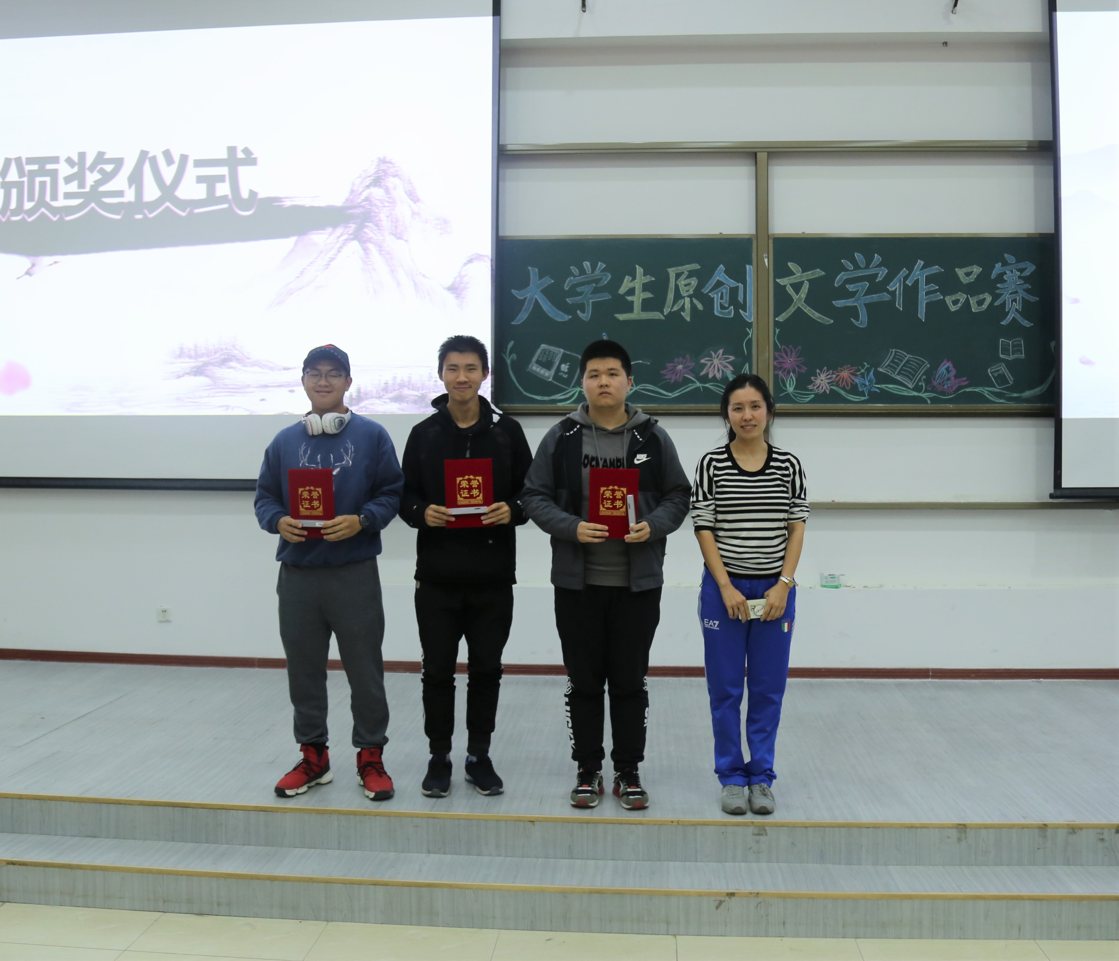 活动至此,评委老师们离开主会场,前往分会场为同学们的作品进行打分。评委老师在细细地品读了参赛选手的作品,对其慎重地给出了自己的判断。评阅过程中,老师们对选手的作品互相发表了自己的见解,对于同学们文学创作的能力给予了充分的肯定,并对部分二轮参赛作品表达了高度的赞扬与欣赏。与此同时,活动主会场进行了文学小常识问答,现场同学积极参与,主持人也对各个问题进行了不同程度的扩展,既丰富了同学们的文学知识,又很好地培养了同学们对于文学的兴趣。在文学小常识问答环节途中,还有不少参赛选手上台与同学们分享了自己的创作灵感以及自身对于文学的一些独到的见解。此外,数学学院学生会副主席王锴强也上台同大家一起分享了自己对文学与数学两者相通性的一些看法。经过评委老师对第二轮比赛作品的打分,结合第一轮的得分情况,在激烈的角逐之后,主持人公布了此次原创文学作品大赛的最终结果。其中,向小吉荣获吉林大学大学生原创文学作品大赛一等奖;苗睿、李懿函荣获吉林大学大学生原创文学作品大赛二等奖;李志强、王文聪、张炜煊荣获吉林大学大学生原创文学作品大赛三等奖;王鑫、陈广兴、李殊雨、郭涵、程凯、李晨筱荣获吉林大学大学生原创文学作品大赛优秀奖。数学学院谢敬然老师、曹馨月老师、文学院李菲老师、文学院李明晖老师和文学院姜勇老师分别为获得优秀奖、三等奖、二等奖和一等奖的参赛同学颁奖,并与其一同合影。让我们向这些获奖选手送上真挚的祝贺,也感谢相关工作人员及评委老师的辛勤付出。本次大学生原创作品大赛圆满结束!