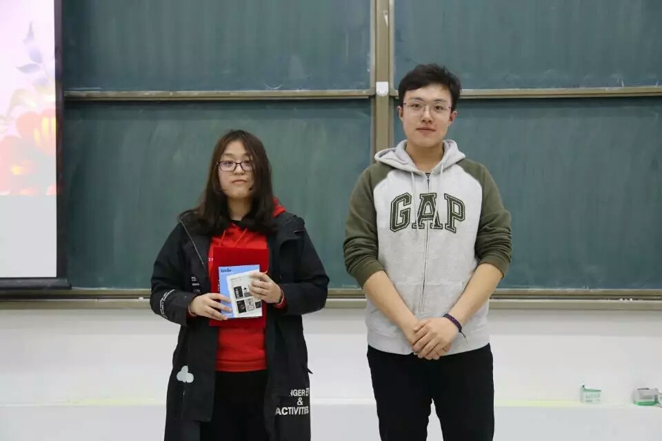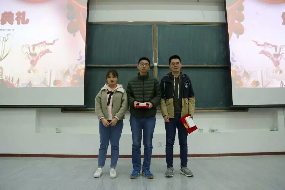本次比赛参赛选手讲课风格各具特色,有的同学举例丰富、贴近生活,有的同学慢条斯理,从容不迫,有的同学随性恣意,别具一格;讲课内容亦是五花八门,数学分析,高等代数,空间解析几何,常微分方程等等,选手们思路清晰,表达清楚到位,并有自己的独到见解;讲课形式丰富多样,手写板书,板书或工整规范,或随性恣意;PPT辅助,PPT简洁明了,美观大方。讲台上的同学们神采奕奕,自信从容,大方得体,颇具老师风范。讲台下的观众亦是全神贯注,仔细聆听,收获颇丰。现场还设有趣味问答环节,同学们热情高涨,紧张思考,积极响应,纷纷举手回答问题。各位评委秉持着公平公正的原则为各位选手进行现场打分,评选出一等奖一名(17级马琰)、二等奖一名(18级吴岳霖)、三等奖两名(16级黄海涛 18级何易繁),分别由团委副书记郑旭东、团委副书记兼社联主席赵雯晗、新媒体中心主任兼学生会副主席王思梦为获奖选手颁奖。最后,各位评委,获奖选手及工作人员合影留念。至此,数学学院讲课大赛完美落下帷幕。