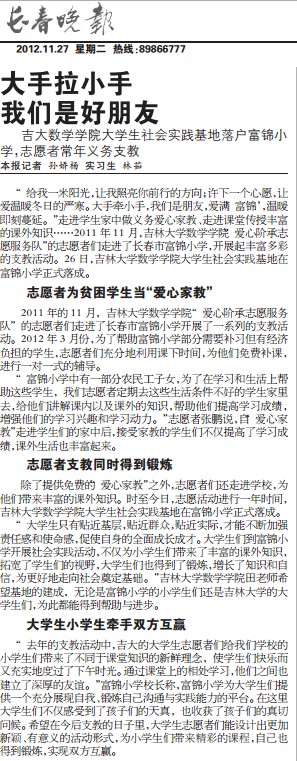 今天《长春晚报》报道数学学院志愿者签下敬老院,长期为老人送温暖