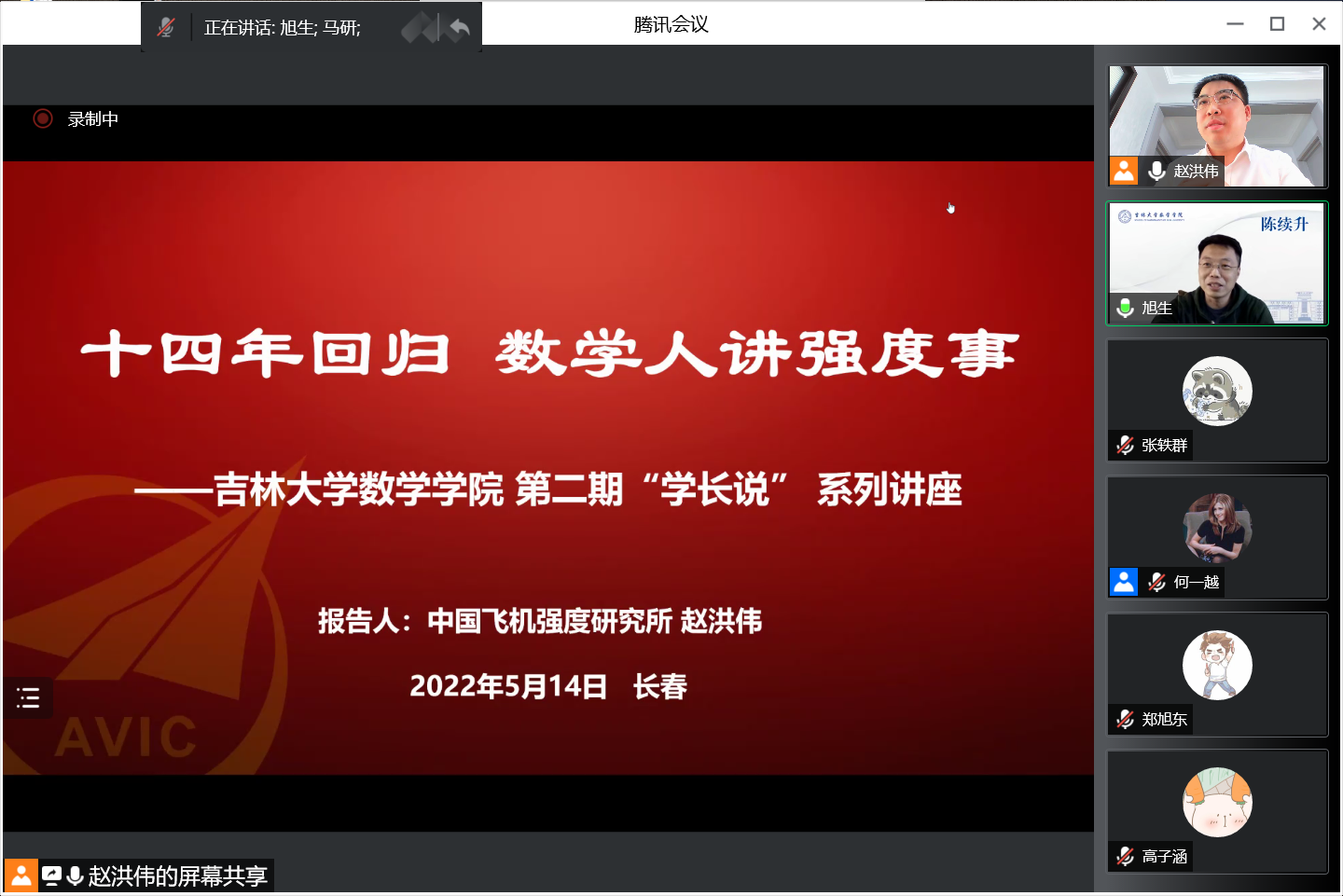 为做好研究生就业创业引导工作,帮助学生树立正确的就业观、择业观、成才观,数学学院研究生“学长说”系列活动第二期之“十四年回归 数学人讲强度事”于2022年5月14日18时成功举办。本次活动特邀嘉宾为中国飞机强度研究所的赵洪伟老师。数学学院党委副书记陈续升参加会议并致辞。
