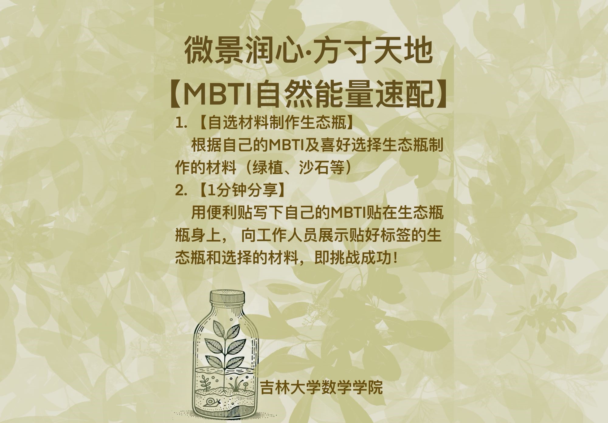 5月25日是“大学生心理健康日”,“5·25”的谐音为“我爱我”,爱自己才能更好地爱他人。此节日的核心内容是:关爱自我,了解自我,接纳自己,关注自己的心理健康和心灵成长,提高自身心理素质,进而爱别人,爱社会。本次活动围绕心理健康主题展开,旨在提高大学生对心理健康的关注与认知。活动前期,组织方通过线上宣传和线下展示普及了MBTI人格类型与心理调适等相关知识,帮助同学们更好地了解自我,关注内心状态。活动现场设有MBTI速配生态瓶互动区与微景观生态瓶DIY区,融合趣味与疗愈于一体。