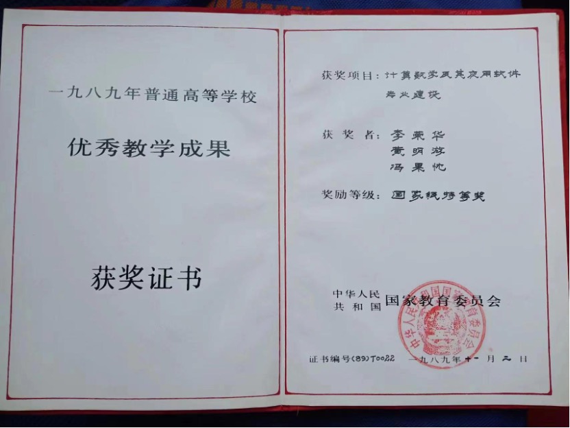 李荣华先生一生忠于教育事业,立身正直、治学严谨。他重视基础课教学,曾为本科生和研究生讲授过数学分析、复变函数等23门课程。先生以身示范,精心编著了《微分方程数值解法》《解边值问题的Galerkin方法》《微分方程广义差分法》等多部经典教材,成为全国计算数学专业沿用至今的通用教材,已经多次再版印刷,培养了一代代数学人。先生曾带领团队获得国家级优秀教学成果特等奖、国家教委优秀教材二等奖。