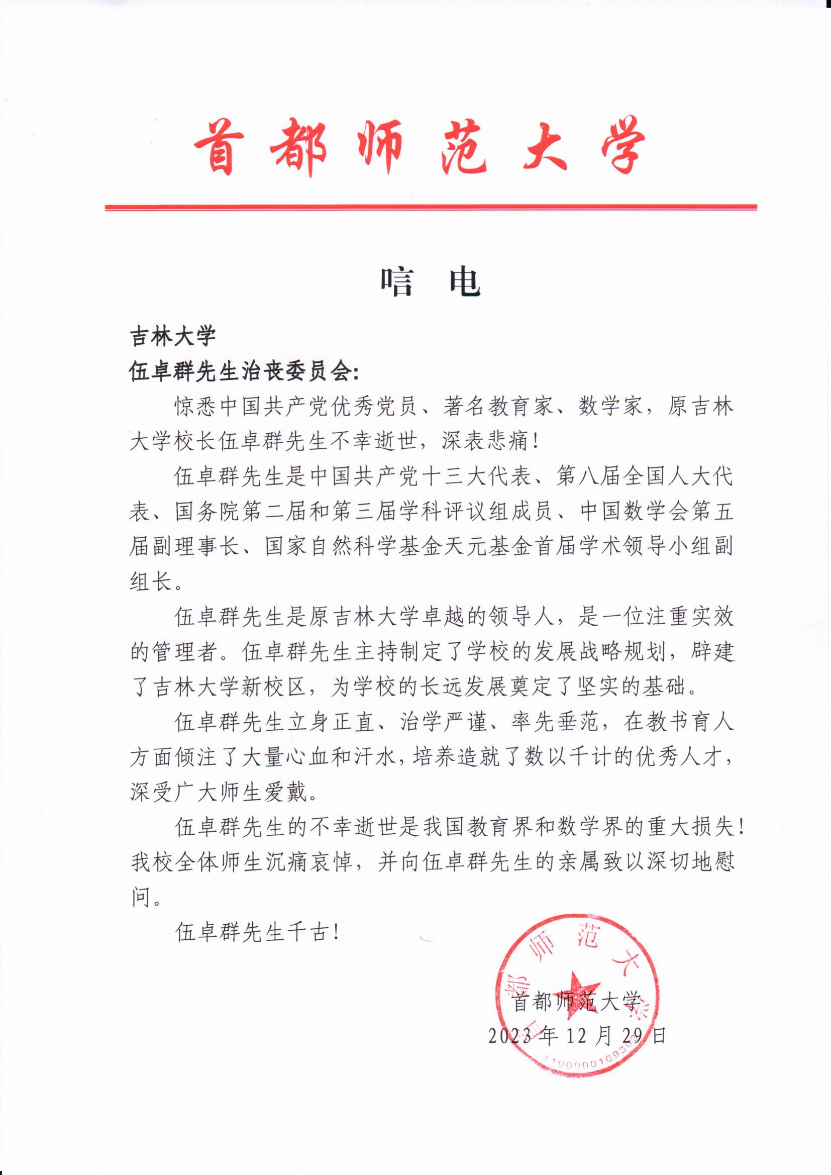 首都师范大学唁电