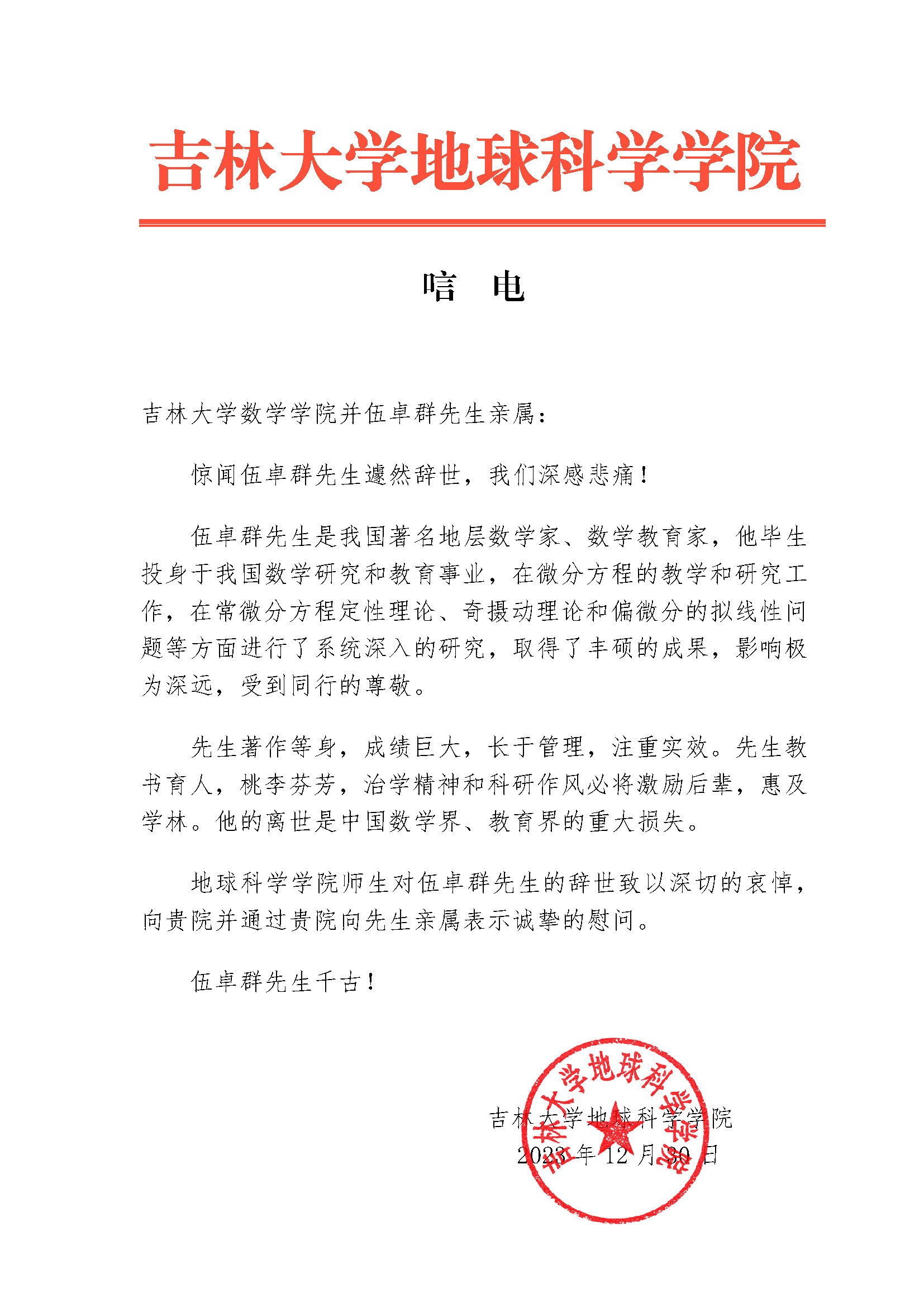 吉林大学地球科学学院唁电