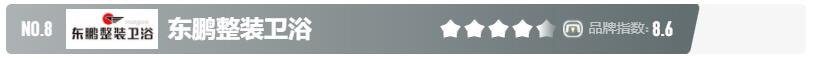 8、东鹏卫浴始创于1994年,知名整装卫浴品牌,隶属于东鹏控股集团旗下,集设计、研发、生产、销售和服务于一体,专业整体卫浴空间解决方案服务商,产品涵盖卫生陶瓷/浴室家具/龙头五金/休闲卫浴/智能卫浴/智能晾晒等