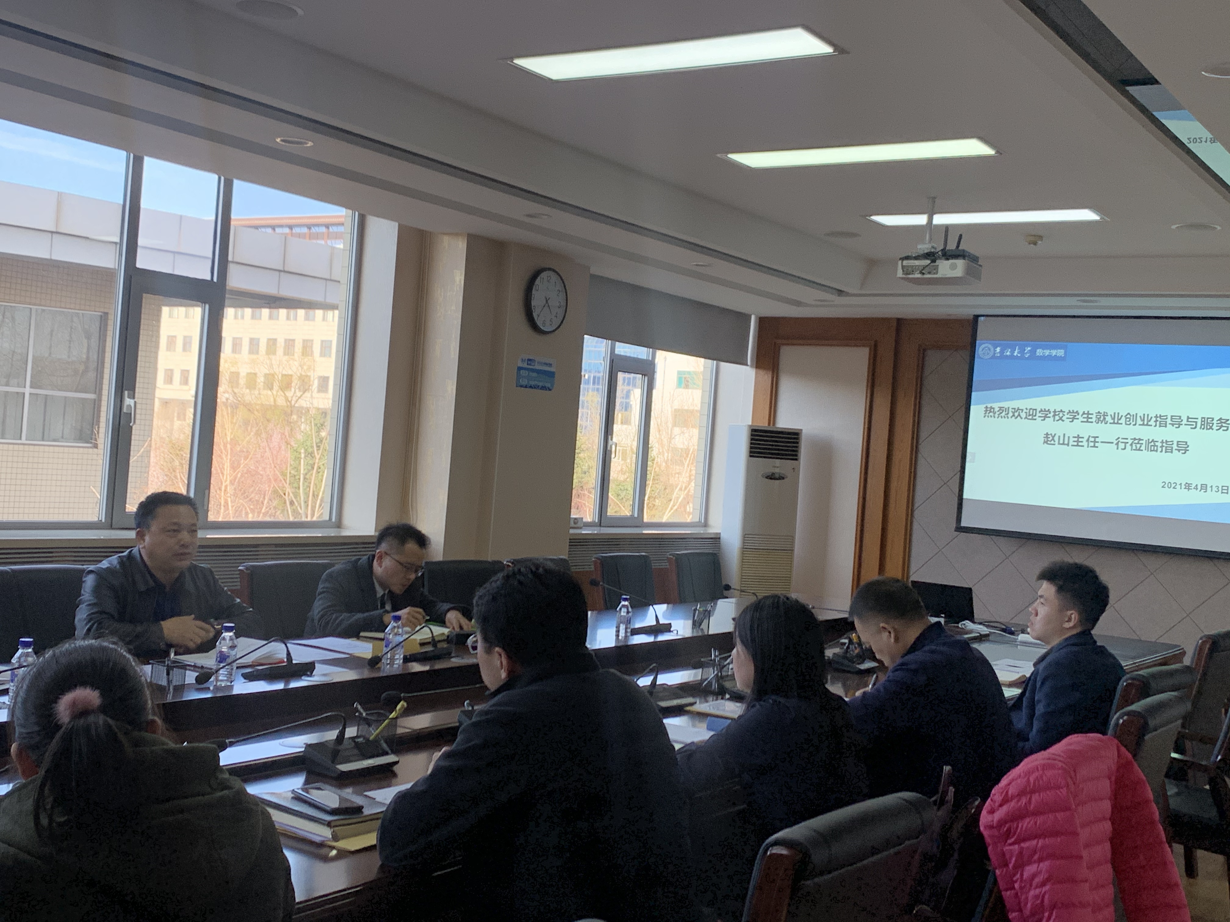 2021年4月13日下午,学生就业创业指导与服务中心赵山一行来到数学学院,对学生就业创业情况进行专项调研座谈。会议由学院党委书记、院长张然主持。
