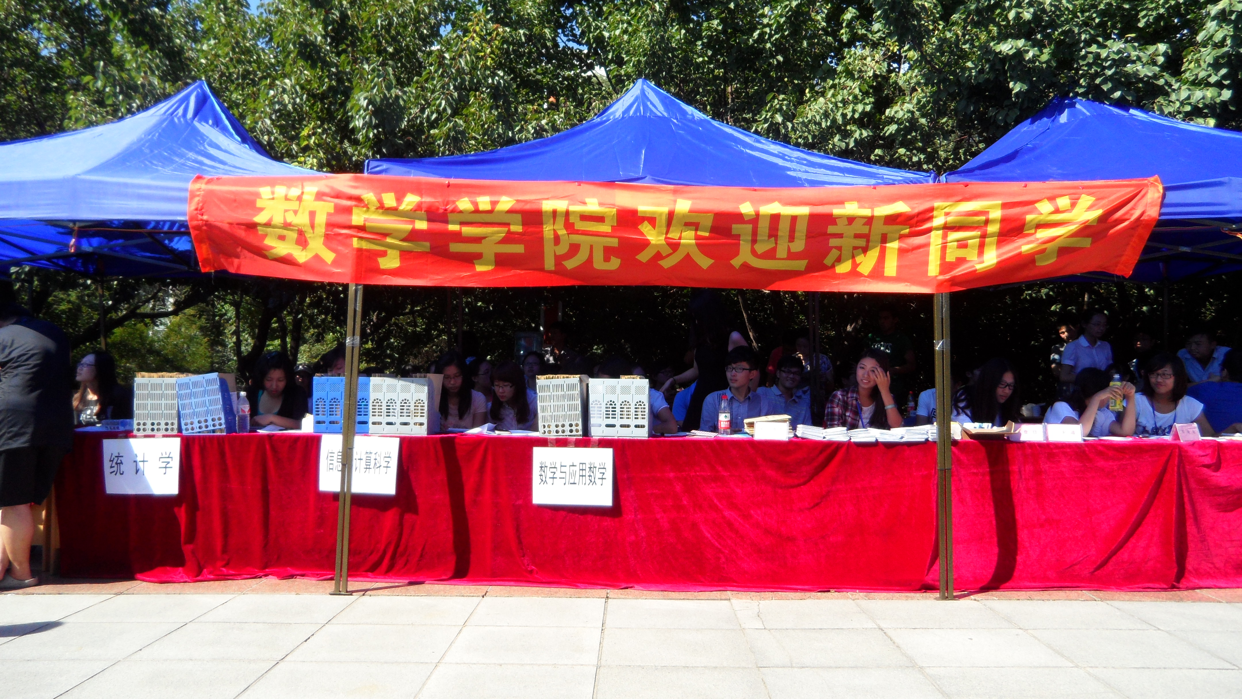 8月23日,数学学院继迎新工作部署之后,展开相应的工作,兵分两路,以确保迎新的顺利进行。 一方面组织一支队伍完成新生材料档案的分类整理、寝室安排及各项准备工作;另一方面在学校东门、北门设立迎新地点,由各志愿者小组负责提前来校报到的新生接待工作。同时在五月花广场搭建迎新帐篷,确保迎新工作顺利进行。