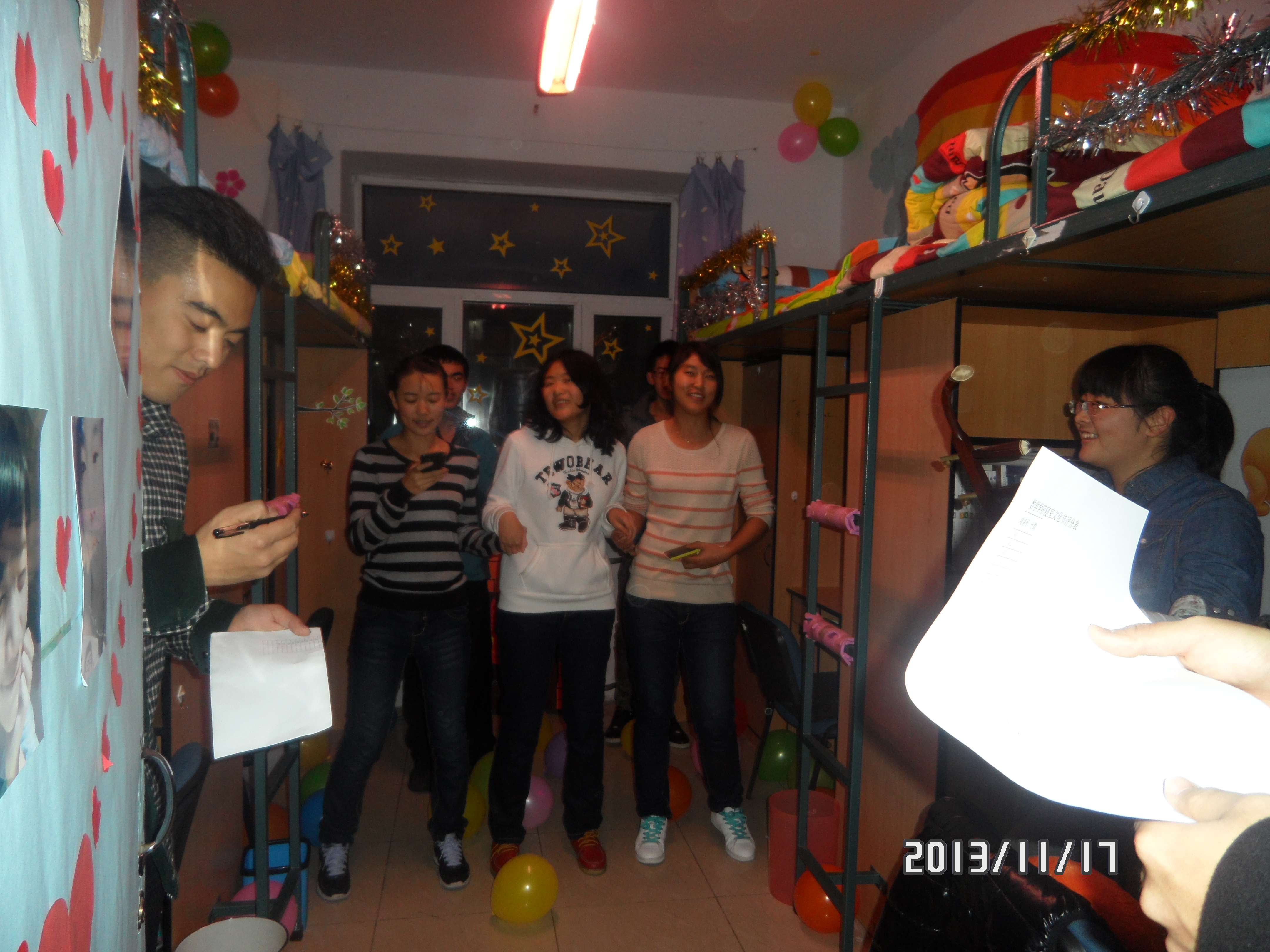 11月17日下午四点,由数学学院学生会女综部主办的2013级寝室文化节女生部分顺利展开。学工办主任崔帅老师、辅导员申川老师,学生会主席王艺霖、团委副书记迟仲达、社团联合会主席齐霄虹以及其他一些学生干部作为评委参加此次评比活动。