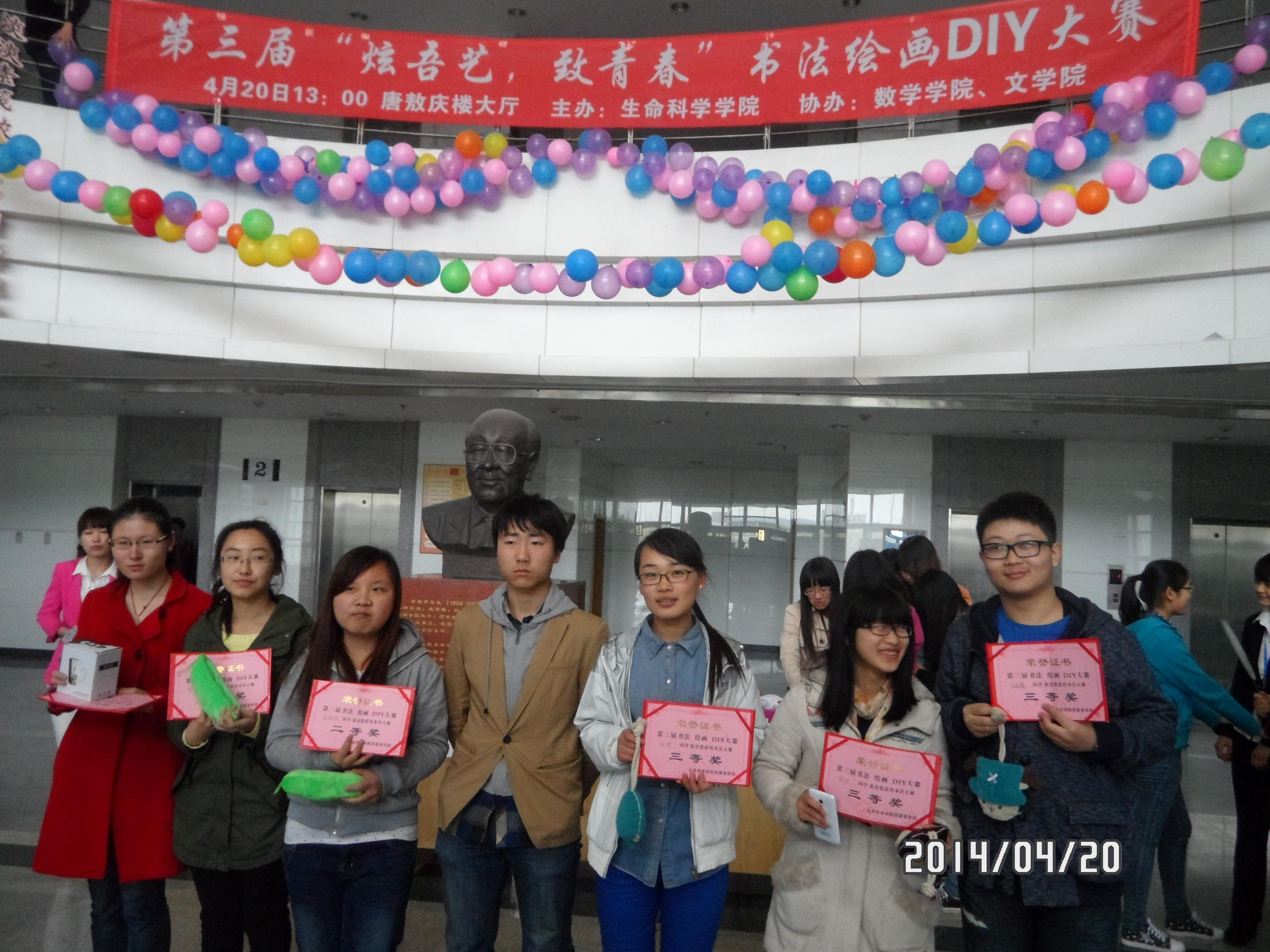 4月20日下午1:00主题为“炫吾艺,致青春”的第四届书法绘画DIY创意大赛在唐敖庆楼大厅隆重举行。本次活动由生命科学学院,数学学院和文学院三个学院的团委宣传部联合举办,有数十名同学参加,同场竞技。