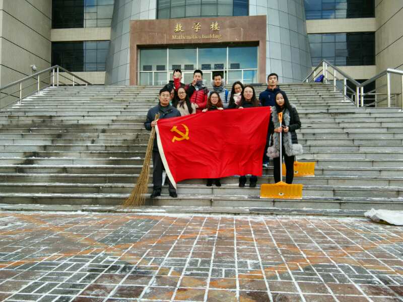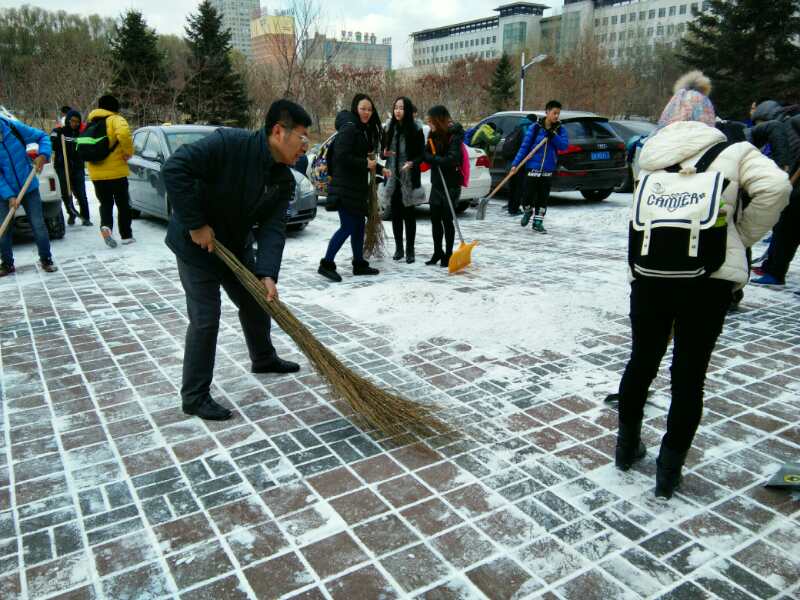 为预防积雪带来的安全隐患,增强同学们的团队合作意识,11月8日,在数学学院党委副书记兼副院长赵任老师,2015级辅导员崔帅老师,2016级辅导员李庚老师的带领下,14,15级党员及16级全体学生清扫了数学楼前的积雪。
