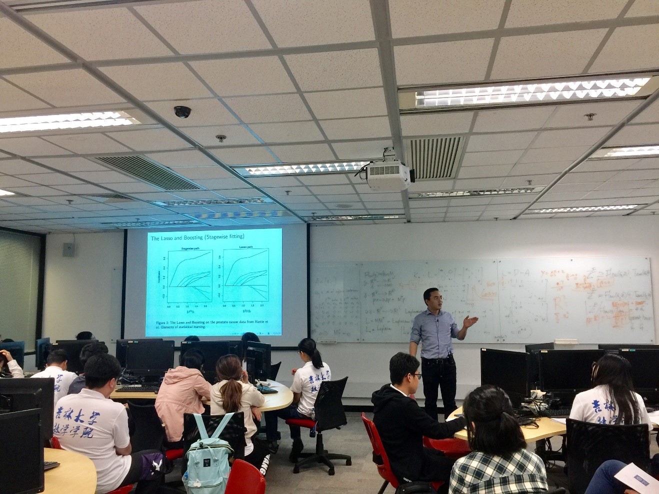 11月12日,同学们开始了第二日的学术交流之旅。上午,我们首先参加了由ProfessorCan YANG 带来的讲座“Statistical and machine learning methodsfor large scale genomic data analysis.”大数据的时代已经到来,作为双一流大学的学子,我们有必要紧跟时代与研究的潮流,而熟练掌握一些辅助工具,更会使我们在学术研究到道路上如虎添翼。杨教授在课上为我们介绍了许多数据与机器学习方面的思想与方法,同时为我们介绍了许多在科研中所需的必备工具,向同学展示了数学的新颖之处,与时俱进的风采。