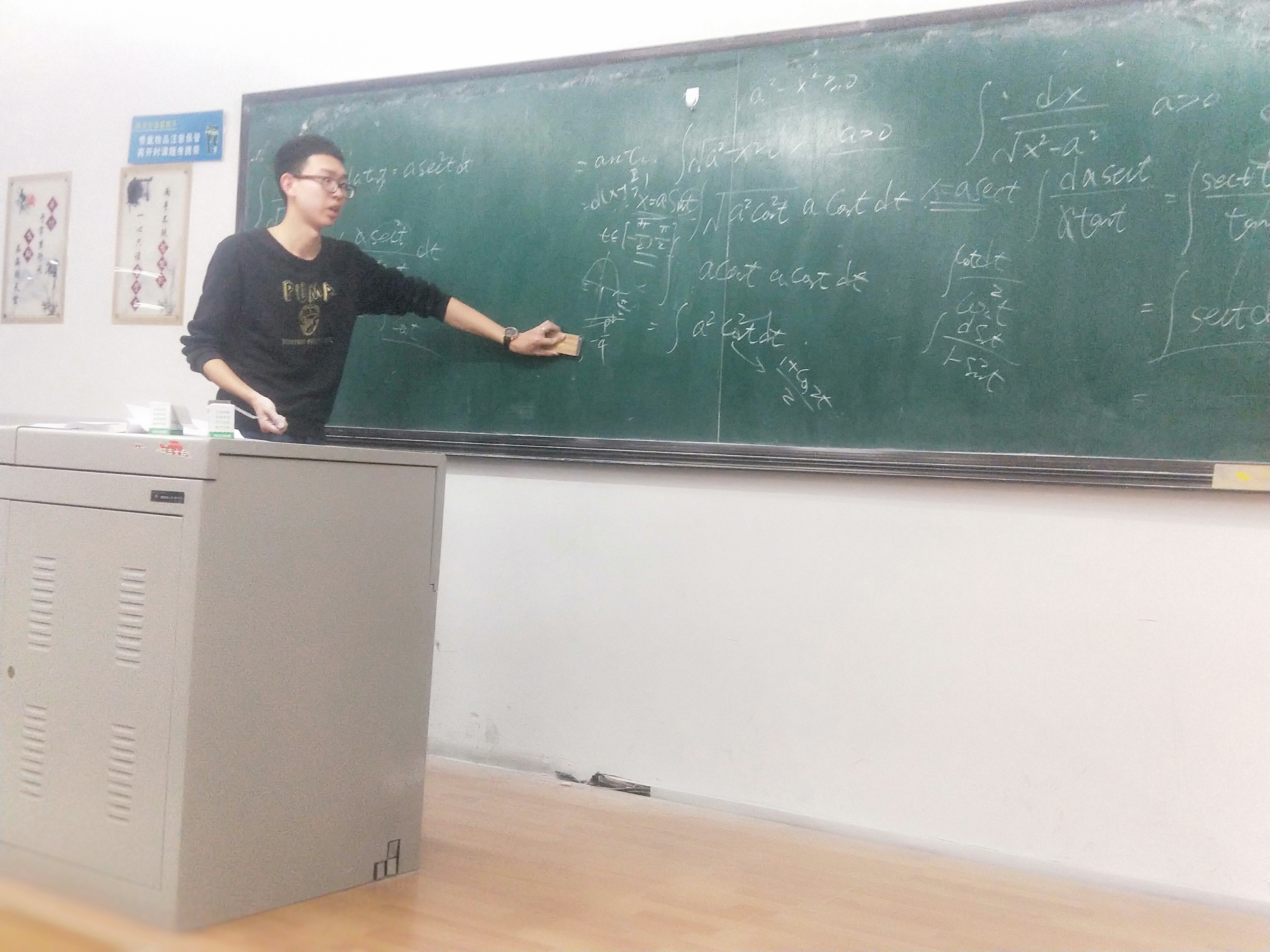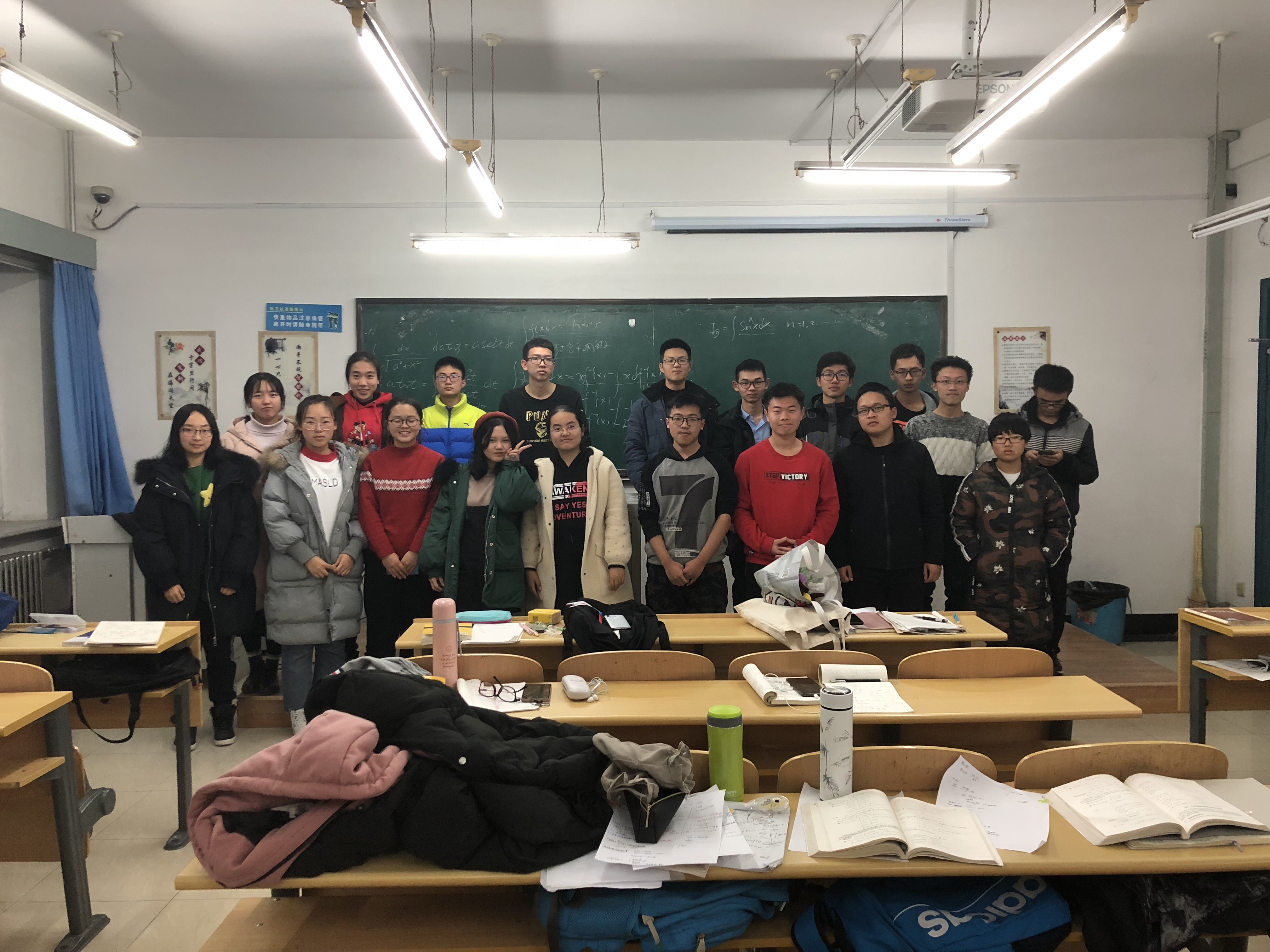 王嘉葳同学的讲解得到了阵阵掌声,随后由石天齐同学为同学们讲不定积分。作为积分学的开端,石天齐同学为这次课做了充足的准备,他从不定积分的产生,不定积分的定义,不定积分的性质和不定积分的运算法则等方面对不定积分的基础知识进行了全面的梳理。紧接着石天齐同学又向大家提问了一些基本初等函数的原函数,并简单讲解了第一换元积分法、第二换元积分法和分部积分法,石天齐同学在知识点之间穿插了很多例题,将理论知识应用在实际问题中,加深了同学们对不定积分的理解。在石天齐同学精彩的讲解之后开始了答疑环节。同学们向志愿者询问了许多线下活动和近期高数课程中遇到的问题,志愿者们对同学们的疑问进行了耐心的解答。并对与这些问题相关的知识点做了解释。全部问题解答完毕,大家合影留念,本次活动圆满结束。