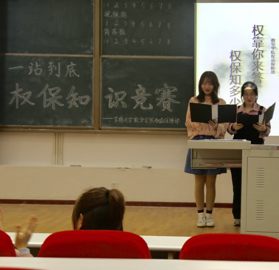为了普及维权相关知识,提高学生的维权意识,营造一个良好的学习生活环境,数学学院权益保障部于3月31日在经信二阶举办了新颖有趣的315“一站到底”权保知识竞赛活动。