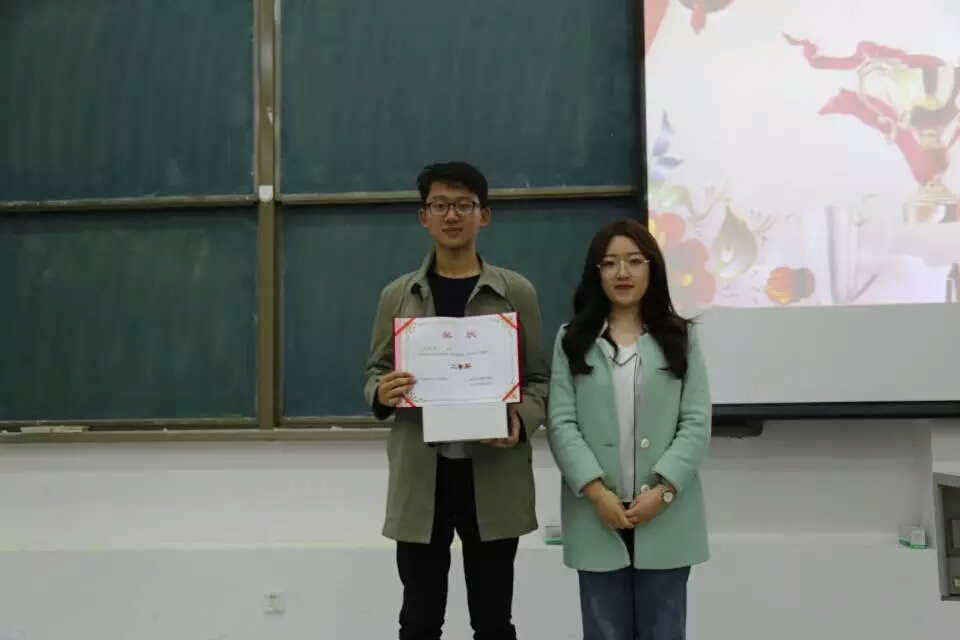 本次比赛参赛选手讲课风格各具特色,有的同学举例丰富、贴近生活,有的同学慢条斯理,从容不迫,有的同学随性恣意,别具一格;讲课内容亦是五花八门,数学分析,高等代数,空间解析几何,常微分方程等等,选手们思路清晰,表达清楚到位,并有自己的独到见解;讲课形式丰富多样,手写板书,板书或工整规范,或随性恣意;PPT辅助,PPT简洁明了,美观大方。讲台上的同学们神采奕奕,自信从容,大方得体,颇具老师风范。讲台下的观众亦是全神贯注,仔细聆听,收获颇丰。现场还设有趣味问答环节,同学们热情高涨,紧张思考,积极响应,纷纷举手回答问题。各位评委秉持着公平公正的原则为各位选手进行现场打分,评选出一等奖一名(17级马琰)、二等奖一名(18级吴岳霖)、三等奖两名(16级黄海涛 18级何易繁),分别由团委副书记郑旭东、团委副书记兼社联主席赵雯晗、新媒体中心主任兼学生会副主席王思梦为获奖选手颁奖。最后,各位评委,获奖选手及工作人员合影留念。至此,数学学院讲课大赛完美落下帷幕。
