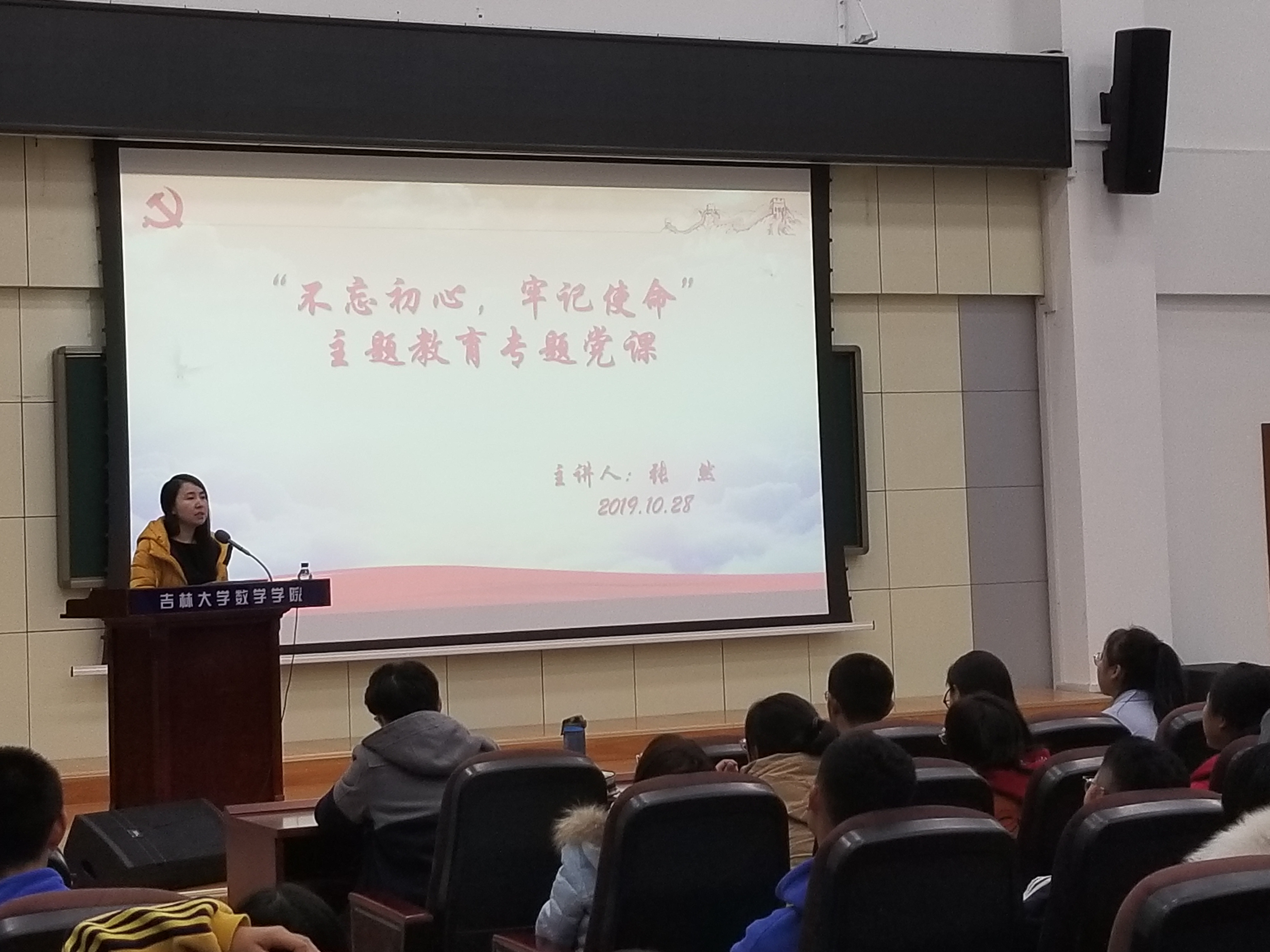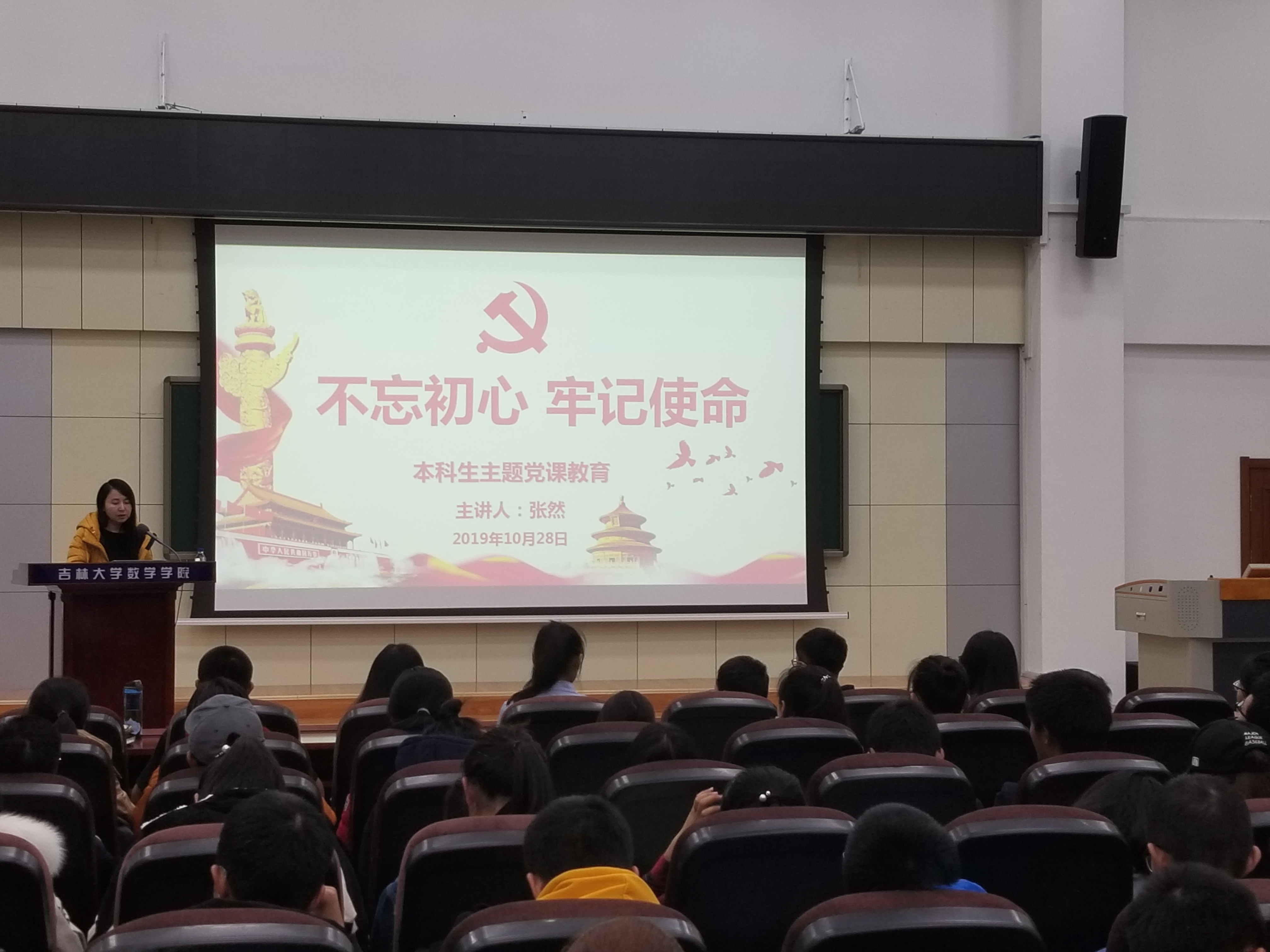 为贯彻落实中共中央的工作部署和《吉林大学开展“不忘初心、牢记使命”主题教育实施方案》的具体工作要求,beat365中国官方网站于2019年10月28日下午七点,在数学楼报告厅进行了面对19级全体同学的党课。本次党课由数学学院党委书记张然教授主讲。