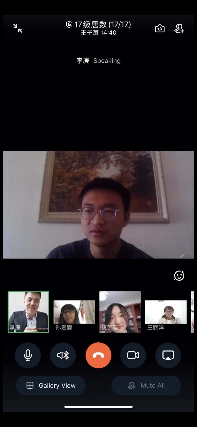 本次出席人员有2017级唐敖庆班全体同学和辅导员李庚。首先,李庚老师向大家说明了学校防疫工作的各项措施,强调了学校对同学们居家防疫的要求。接着,李庚老师与大家共勉了习主席写给北京大学援鄂医疗队全体“90后”党员的回信。信中说“青年一代有理想、有本领、有担当,国家就有前途,民族就有希望”,深深鼓舞了班级的同学,同学们都纷纷分享自己身边经历过或者听说过的感人事迹,如自己的高中同学作为青年志愿者参与社区服务工作,驰援湖北的4.2万医护人员中有1.2万是90后、00后。