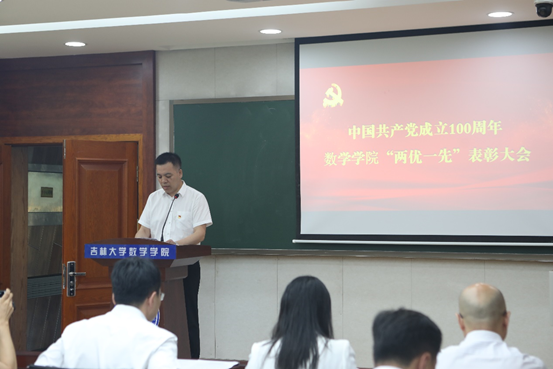 为庆祝中国共产党成立100周年,继承和发扬党的优良传统,激励广大党员牢记党的宗旨、坚定理想信念、强化党员意识、激发学习工作热情,更好地发挥共产党员的先锋模范作用,7月9日,数学学院在数学楼第二报告厅召开“两优一先”表彰大会。党委副书记范庆文主持会议。