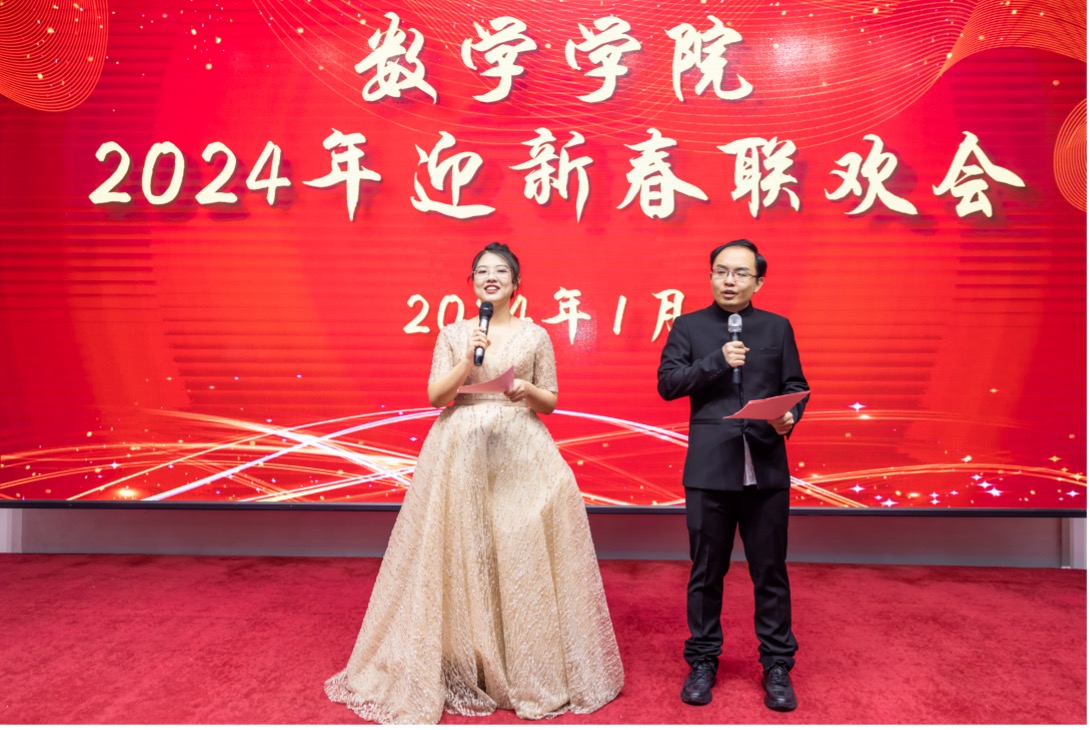 玉兔辞旧岁,瑞龙迎新春。1月10日下午,数学学院“2024年迎新春联欢会”在吉林大学友谊会馆隆重举行。学院全体教职工欢聚一堂,共贺新春,共展宏图。本次联欢会由计算数学系吴畏和基础数学系侯帅两位老师主持。