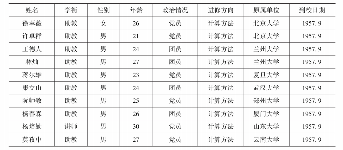 利用苏联专家讲学的机会,在高教部的安排下,吉林大学面向全国组织了计算数学师资培训班。1957年9月,北京大学、兰州大学、复旦大学、武汉大学、郑州大学、厦门大学、山东大学、云南大学(表3)派出青年教师前来进修。特别需要注意的是,北京大学也派人来参加,这与吉林大学最初计划由北京大学代为培养师资形成了巨大的反差。1958年,又有清华大学、西安交通大学、辽宁大学派出青年教师到吉林大学参加培训班[31]。