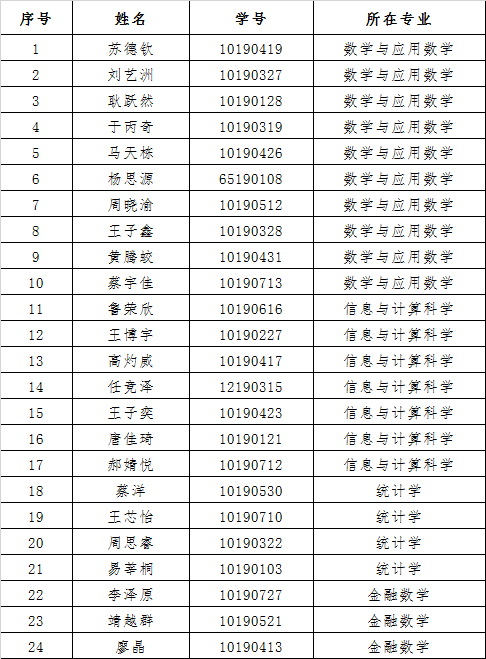 按照《数学学院推荐2019级优秀本科生直接攻读博士学位研究生方案》有关要求,经学生自愿报名、资格审查、推免工作小组会议讨论等环节,确定苏德钦等24名同学为数学学院2023年招收优秀应届本科毕业生直接攻读博士学位研究生校内预选拟推荐人选。名单如下: