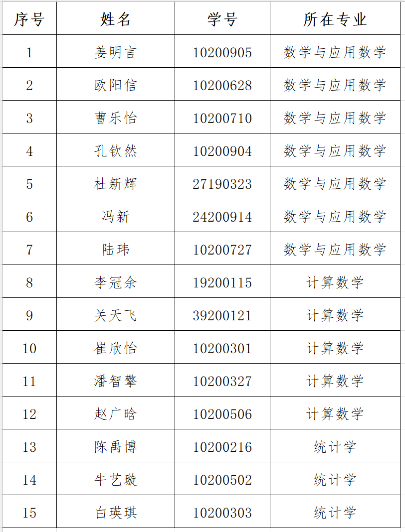 按照《数学学院2024年招收优秀应届本科毕业生直接攻读博士学位研究生校内预选工作的通知》有关要求,经学生自愿报名、资格审查、推免工作小组会议讨论等环节,确定姜明言等15名同学为数学学院2024年招收优秀应届本科毕业生直接攻读博士学位研究生校内预选拟推荐人选。名单如下: