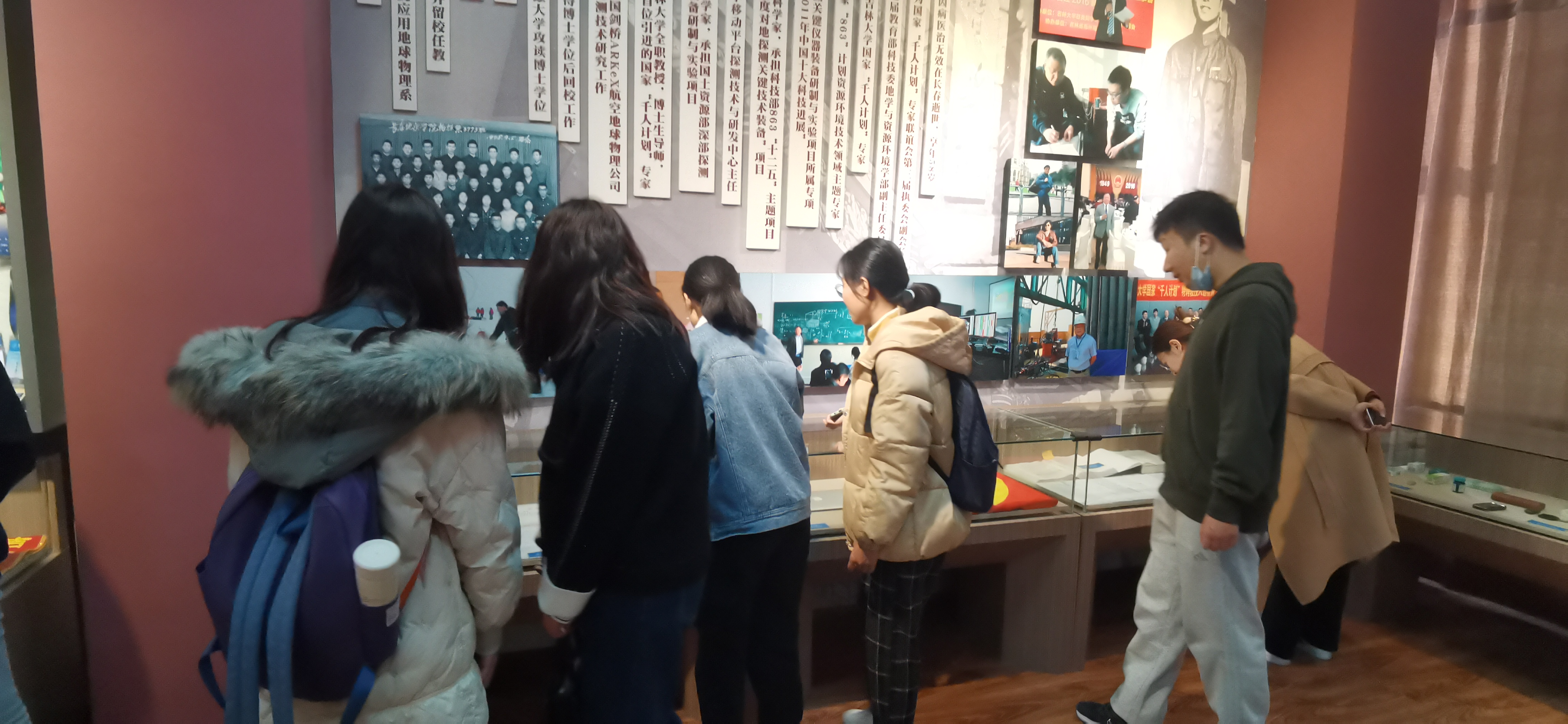 在新建成的黄大年生前用品陈列室和黄老师生前工作的办公室里,展示了黄大年教授生平图片集、团队的重要科研成果、参与的重大项目及获得的重要荣誉。通过档案馆史佳楠老师生动的讲解,同学们了解到了每张图片背后的故事。黄大年老师在大学毕业对同学的赠语中说道:“振兴中华,乃我辈之责”,他也确实做到了。在看完黄大年老师《生命,为祖国澎湃》的短片后,不少同学落下了泪水。