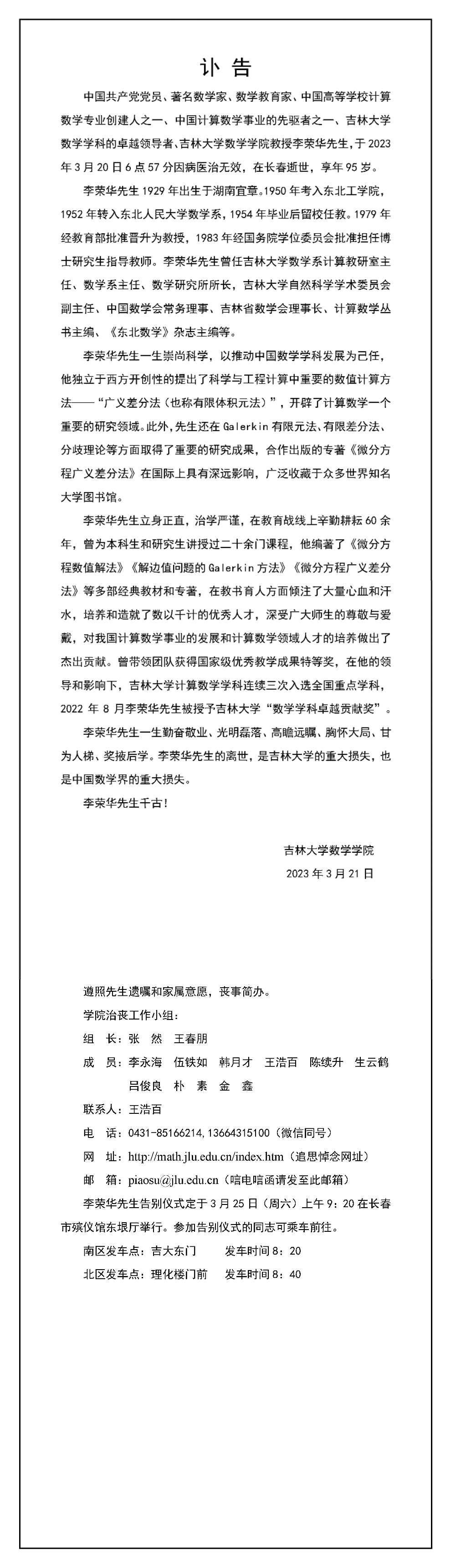 我国著名数学家、吉林大学教授李荣华先生逝世