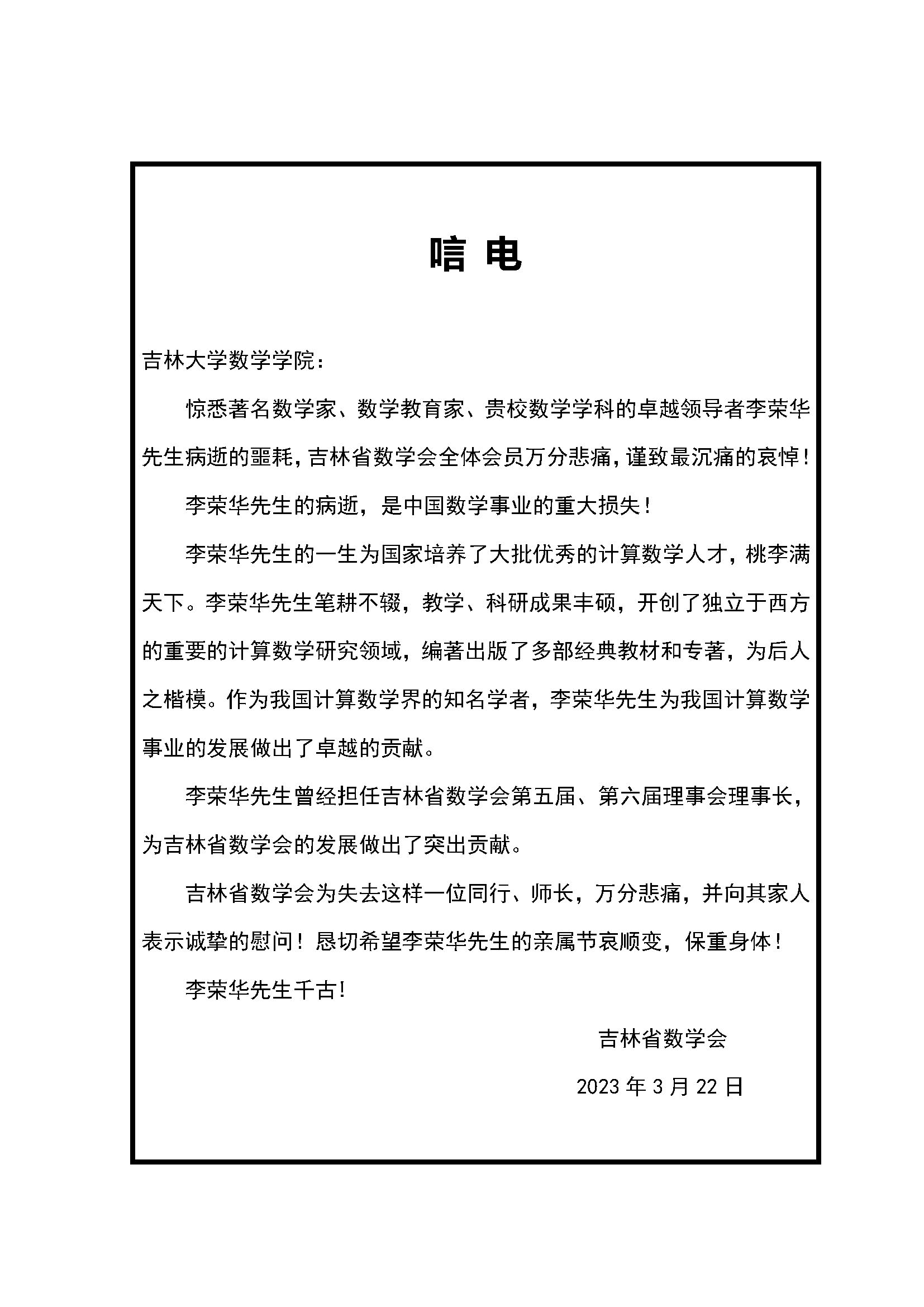 吉林省数学会唁电